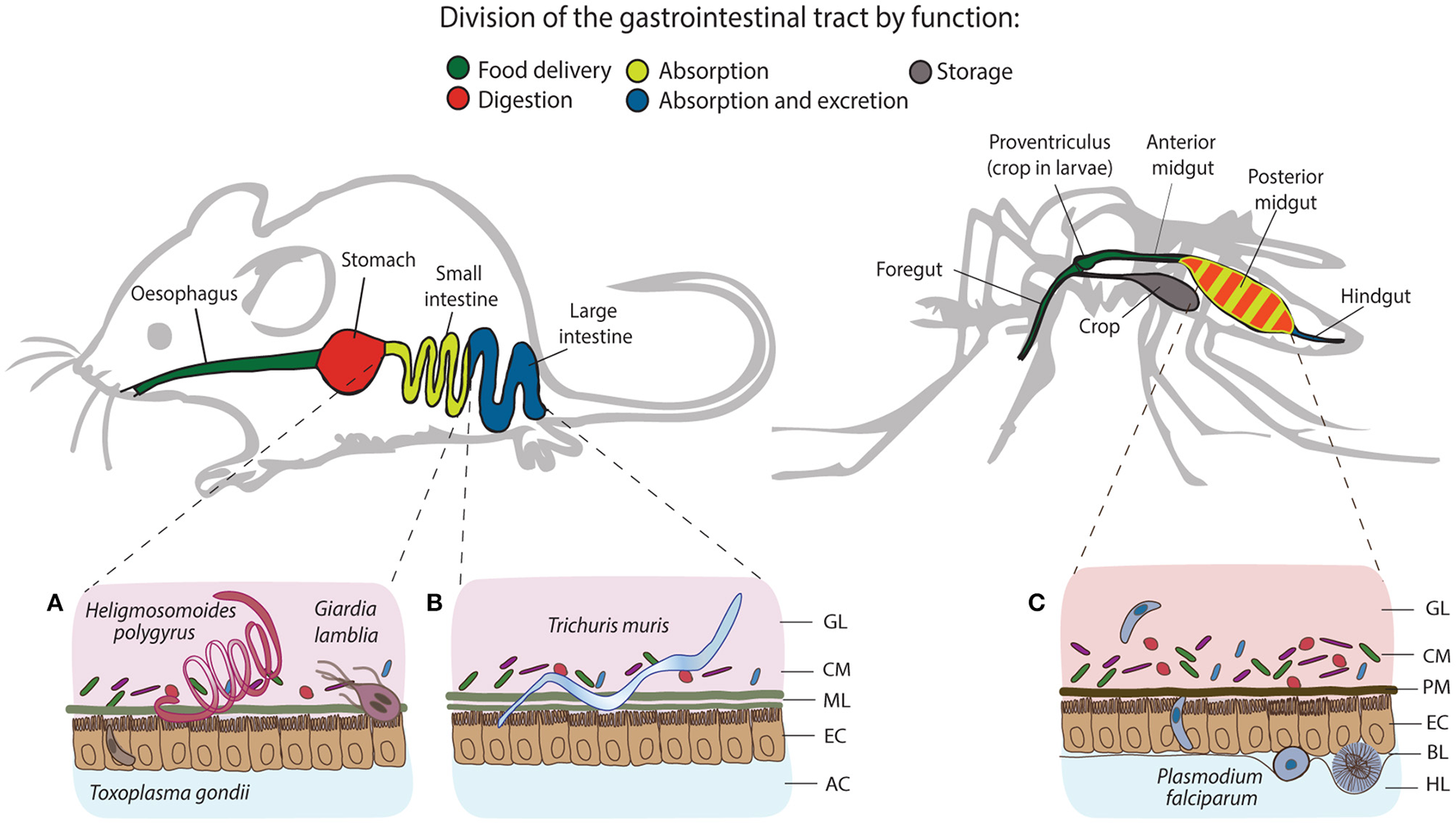 Structural and functional differences of the gastrointestinal tracts of mice and mosquitoes, and the localization of their intestinal parasites. The gastrointestinal tract of mice consists of esophagus, stomach, small and large intestine, and colon, whereas in mosquitoes, it comprises the foregut, diverticulum (crop), midgut (anterior and posterior) and hindgut. One of the differences between gut organization is the separation of the food digestive and nutrient absorption functions taking place in the stomach and the small intestine of mice. In mosquitoes, digestion and absorption occur in the same organ, the midgut. The tracts secrete a protective layer that serves as a mechanical barrier against the acidic gastric environment and diverse pathogens. In mammals, epithelial goblet cells dispersed throughout the epithelium produce a viscous mucus layer that covers the entire tract, except the large intestine, which is characterized by a double mucus layer. Similarly to mucus, mosquitoes secrete the peritrophic matrix (PM), a semi-permeable extracellular structure composed of chitin and glycoproteins. In larvae, the PM is secreted continuously by a specialized organ cardia located in the anterior midgut, whereas in adult females, it is believed to be secreted by the midgut epithelial cells only after blood feeding. Small (A) and large (B) intestines of mice harbor a series of gastrointestinal parasites: Toxoplasma exploits the small intestine for the establishment of the infection; Giardia and adult Heligmosomoides polygyrus worms thrive in the lumen of the small intestine, while adults of Trichuris muris anchor to the epithelial cells of the large intestine. In mosquitoes, Plasmodium invades the posterior midgut to establish extracellular infection at the basal side of the epithelial cells (C). GL, gut lumen; CM, complex microbiota; ML, mucus layer; EC, epithelial cells; AC, abdominal cavity; PM, peritrophic matrix; BL, basal lamina; HL, hemolymph.
