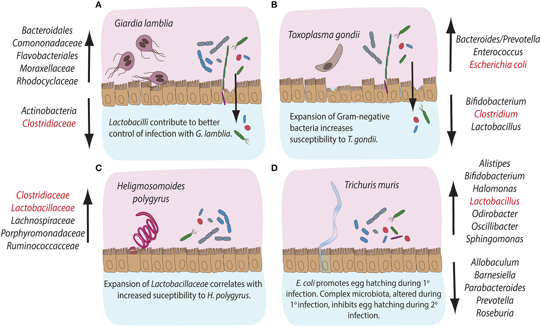 Compositional alterations and functional significances of commensal bacterial groups during intestinal parasite infections in mice. The gastrointestinal tract of mice is home to diverse communities of commensal bacterial species. Infections with intestinal pathogens are known to lead to notable alterations in the commensal microbiota composition of the host. (A) Infection with the extracellular protozoan parasite Giardia lamblia leads to a significant expansion of bacterial groups like Bacteroidales, Comononadaceae, Flavobacteriales, Moraxellaceae and Rhodocyclaceae, while Actinobacteria and Clostridiaceae display reduced abundances. On the other hand, Lactobacilli are known to contribute to an overall better control of Giardia infection. (B) The intracellular protozoan parasite Toxoplasma gondii leads to expansion in Bacteroides/Prevotella, Enterococcus and Escherichia coli, while the abundance of Bifidobacteria, Clostridiales, and Lactobacilli decreases during infection. An overall expansion of Gram-negative bacteria has been shown to contribute to immunopathology during murine infection with T. gondii. (C) Infection with the small intestinal parasitic nematode Heligmosomoides polygyrus leads to a marked expansion of commensal Clostridiaceae, Lachnospiraceae, Porphyromonadaceae, and Ruminococcacce and Lactobacilli, the latter known to correlate with increased susceptibility to infection with H. polygyrus. (D) Infection with the large intestinal nematode Trichuris muris leads to the expansion of Alistipes, Bifidobacteria, Halomonas, Lactobacilli, Odirobacter, Oscillibacter, and Sphingomonas, while Allobaculum, Barnesiella, Parabacteroides, Prevotella, and Roseburia abundances decrease. Notably, commensal E. coli is known to promote egg hatching during primary infection, while complex microbiota alterations occurring during primary infection appear to inhibit egg hatching during secondary infection with T. muris. The bacterial groups highlighted in red have been demonstrated to take part in induction, maintenance or suppression of host immune responses during the corresponding parasitic infections.