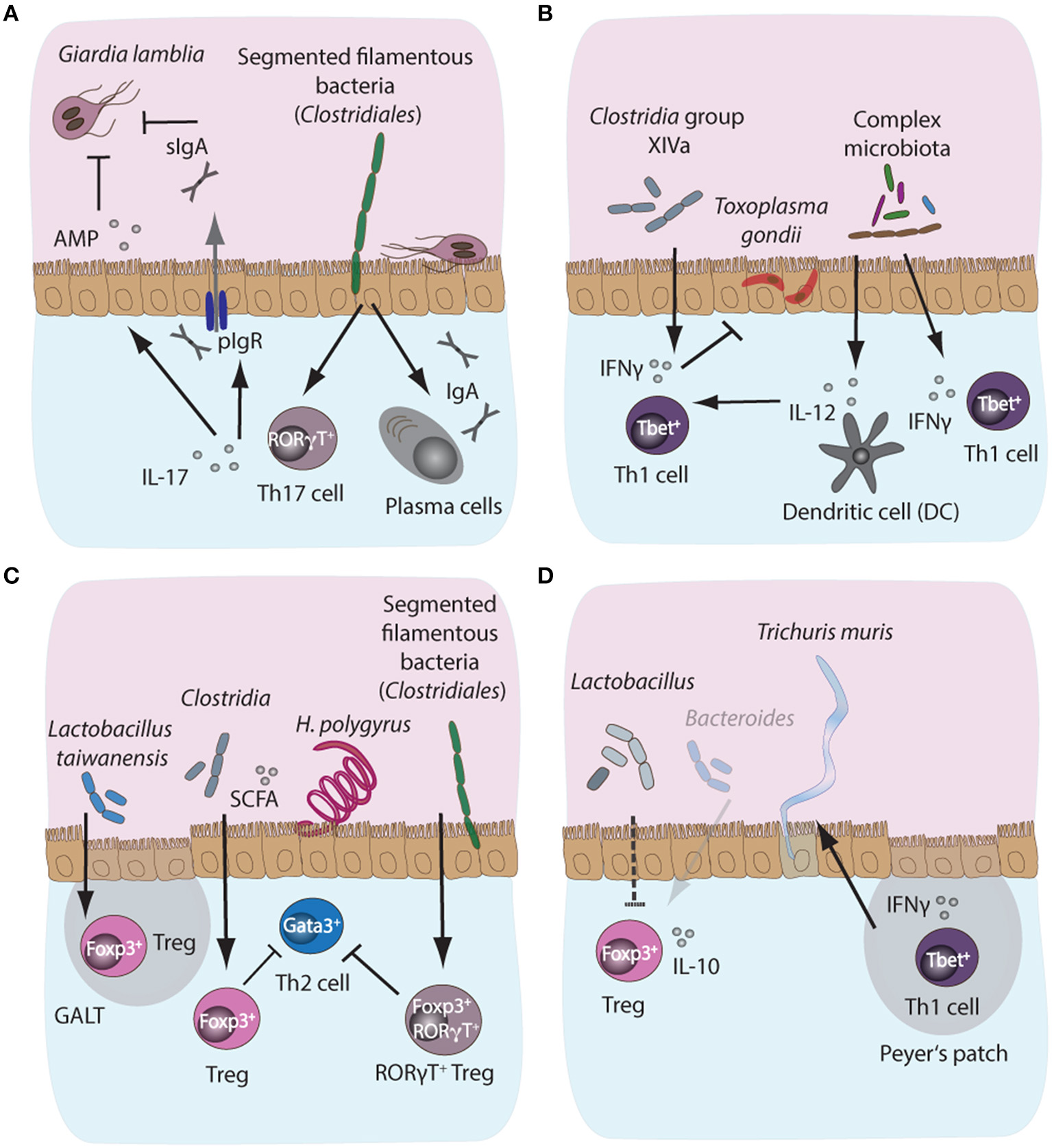 Microbiota-dependent host immune responses during intestinal parasite infections in mice. (A) Segmented filamentous bacteria (SFB), members of the Clostridiales bacterial group colonizing the small intestinal tract of mammals, are potent inducers of intestinal IgA and Th17 responses in mice. Importantly, both IgA and Th17 responses are key host protective immune mechanisms against the protozoan parasite Giardia lamblia. IgA can directly target trophozoites, while IL-17A supports polymeric Ig receptor expression and hence IgA transport into the lumen, in addition to promoting antimicrobial peptide (AMP) secretion by epithelial cells. Resistance phenotypes to giardiasis have previously been linked to the presence or absence of SFB, suggesting a potential correlation between microbiota-induced intestinal IgA and Th17 responses and control of infection with Giardia. (B) During acute murine infection with Toxoplasma gondii, the presence of complex intestinal microbiota leads to MyD88-dependent signaling, triggering protective IL-12 responses in intestinal dendritic cells. (C) During infection with the small intestinal nematode Heligmosomoides polygyrus, the increased abundance of Lactobacilli and Clostridiales producing short chain fatty acids (SCFA)have been shown to induce the expansion of Foxp3+ regulatory T cells (Treg) in the gut, while SFB additionally induce the development of a highly potent immunosuppressory subset of Foxp3+RORγT+ Treg, thus indirectly suppressing Th2 cell responses during infection. (D) A decrease in SCFA-producing Bacteroides and elevated abundances of Lactobacilli during chronic T. muris infection correlate with decreased intestinal Treg numbers and importantly, these Tregs appeared less prone to secrete IL-10 during chronicity.