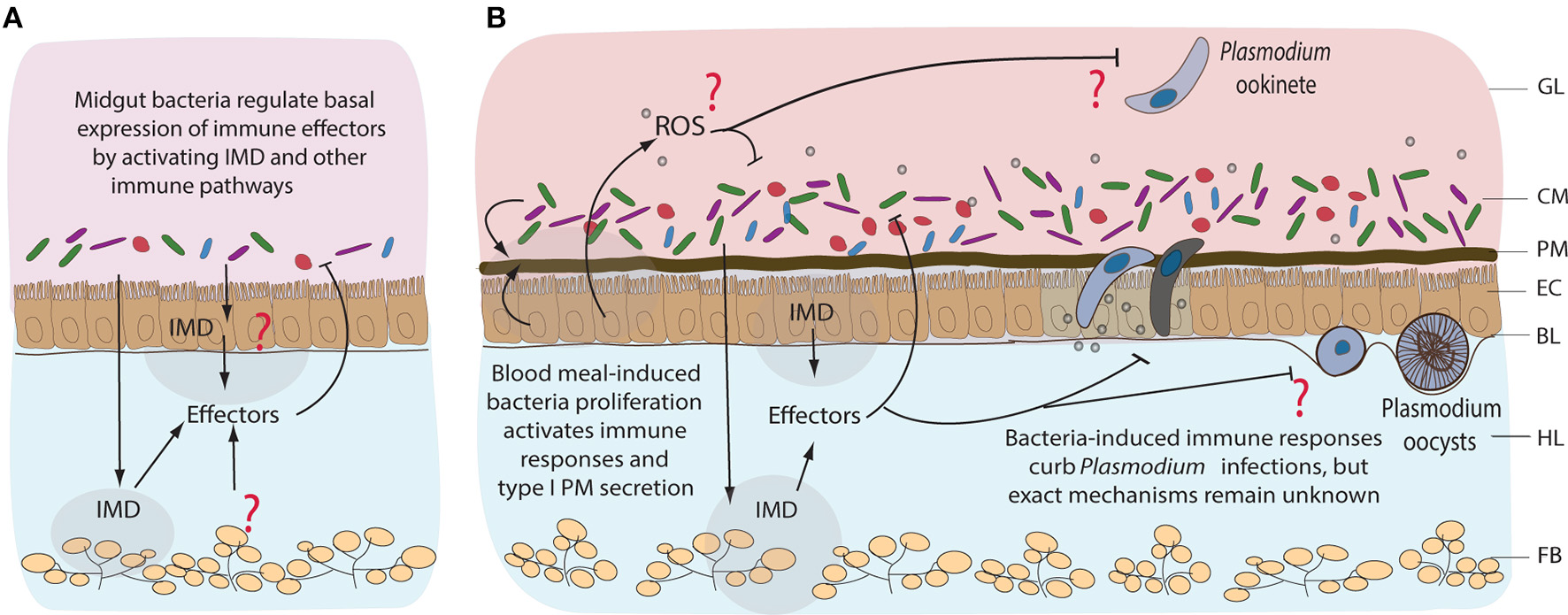 Immune responses of mosquitoes to midgut bacteria and to Plasmodium parasites. Immune responses to resident bacteria before (A) and after blood feeding (B). Proliferation of the midgut bacteria is regulated mainly by IMD pathway, however the tissue specificity of its expression remains unknown. Immune responses could be coming from the gut, hemocytes (mosquito blood cells), or fat body (nutrient storage and immune tissue). Involvement of other immune pathways, including reactive oxygen species (ROS), in response to midgut bacteria is not well-characterized. Blood feeding-induced bacteria proliferation activates immune responses that also curb the invasion of Plasmodium, mainly at the ookinete stage of development. GL, gut lumen; CM, complex microbiota; PM, peritrophic matrix; EC, epithelial cells; BL, basal lamina; HL, hemolymph; FB, fat body.