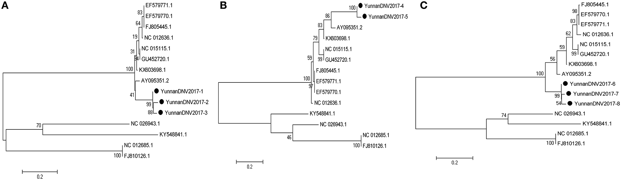 The acquired PCR products were sequenced, and the sequences were aligned against sequences of representative viruses using Clustal W version 2.0. (Accession numbers are shown in the phylogenetic trees). Maximum-likelihood phylogenetic trees were produced using MEGA 7 with 1,000 bootstrap replicates.
