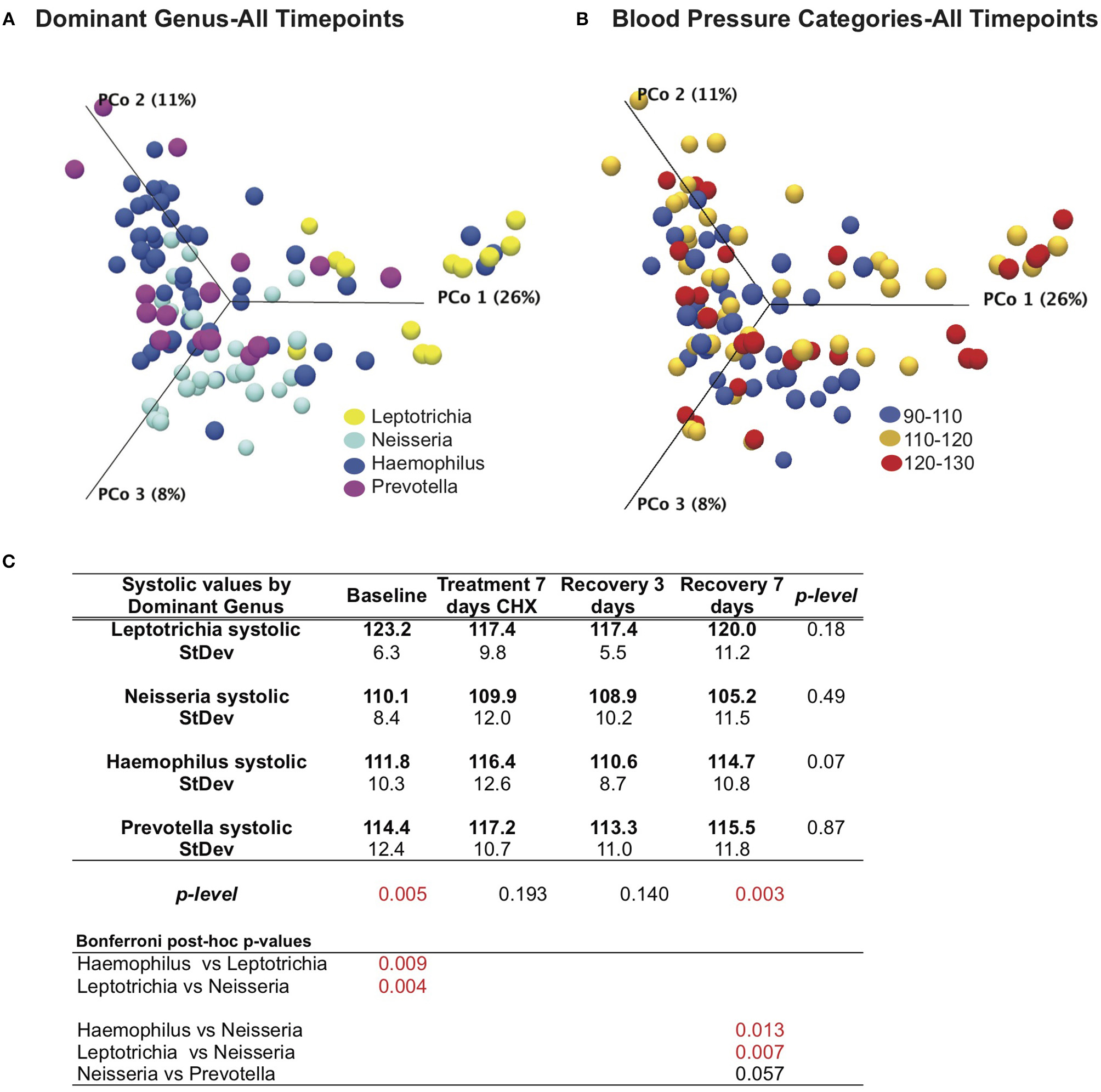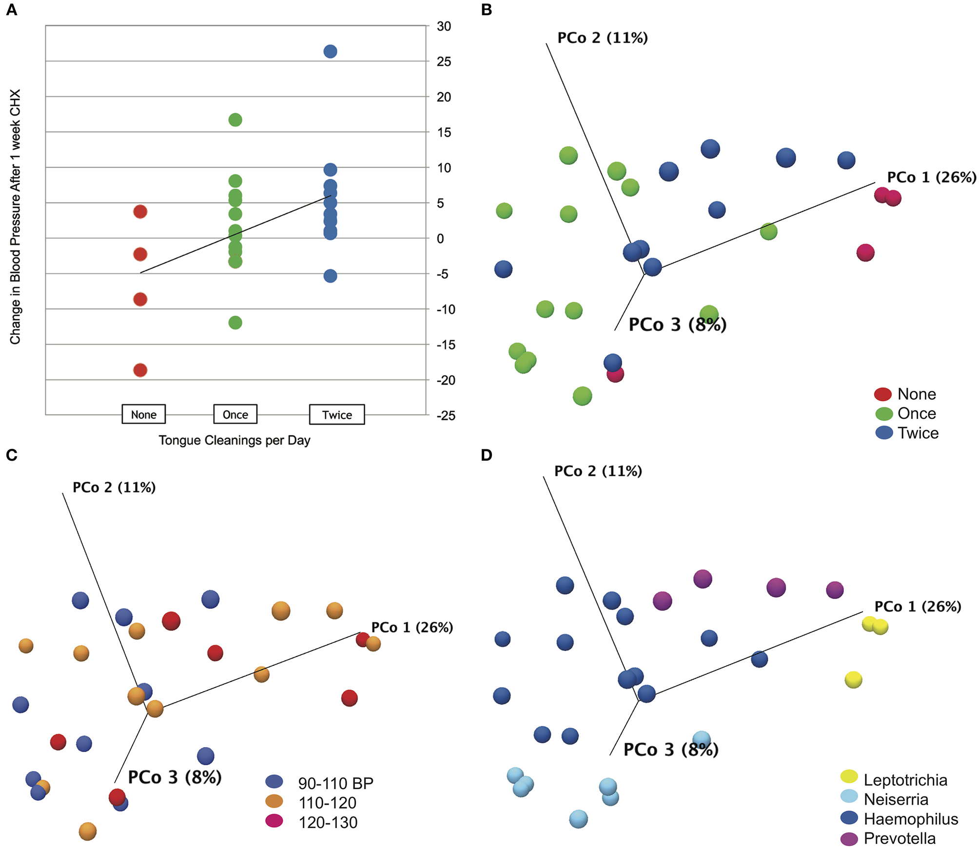 Although there is compelling evidence supporting the role of the tongue microbiome in the enterosalivary nitrate-nitrite-NO pathway, this remains a relatively unexplored area of human-microbial mutualism and many important questions must be addressed. Previous studies have demonstrated that nitrite-induced reductions in blood pressure are inhibited by antiseptic chlorhexidine (CHX) or other antibacterial mouthwashes (Tannenbaum et al., 1976; Govoni et al., 2008; Petersson et al., 2009; Kapil et al., 2013; McDonagh et al., 2015; Woessner et al., 2016; Mitsui and Harasawa, 2017). The focus of these studies has been from the perspective of cardiovascular physiology, and little information is available regarding the oral health status or habits of subjects in these studies. In this study we approach this symbiotic relationship from the perspective of oral health using a cohort of 27 oral health professionals with both excellent cardiovascular and oral health. These subjects used a CHX mouthwash for 7 days, and we assessed the response of resting systolic blood pressure and tongue microbiome community composition before and after exposure to this potent antimicrobial agent. The human oral microbiome is highly variable between individuals; therefore, we hypothesized that there would be inter-subject variability in response to CHX dependent upon the composition of the baseline tongue microbiota. In this study we provide the first assessment of the tongue microbiome in parallel with resting blood pressure in healthy individuals treated with CHX.