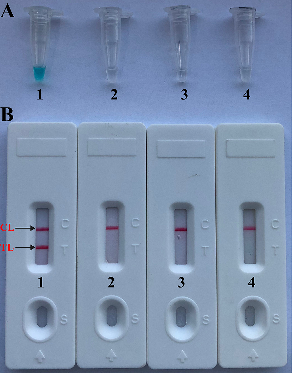 Confirmation and verification of Brucella-MCDA products. (A) Color change of Brucella-MCDA tubes; (B) LFB applied for visual detection of Brucella-MCDA products. Tube A1 (biosensor B1), positive amplification; tube A2 (biosensor B2), negative amplification (Salmonella), tube A3 (biosensor B3), negative amplification (Bacillus cereus), tube A4 (biosensor B4), negative control (DW).