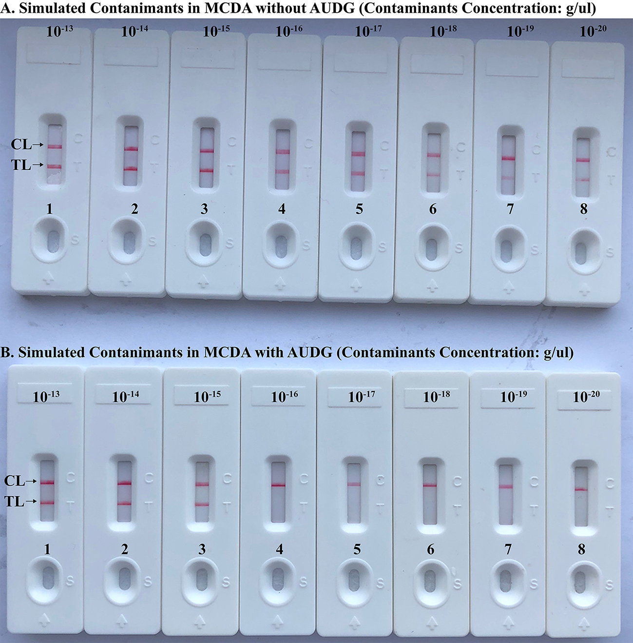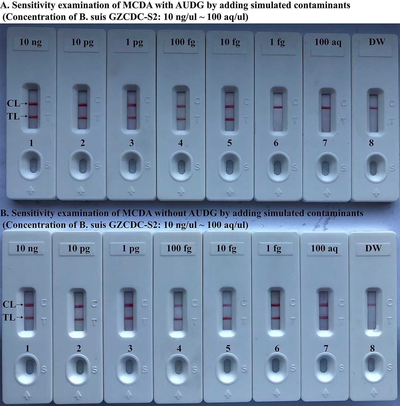 The MCDA amplicons produced from 10 pg/μl in absence of AUDG enzyme were quantitated using ultraviolet spectrophotometer (NanoDrop ND-1000, Calibre, Beijing, China), which were used for making serial dilution from 1 × 10−13 to 1 × 10−20 g μL−1. A volume of 1 μl of each dilution was employed as the templates for MCDA reactions, which were used as the source of simulating carryover contaminants.