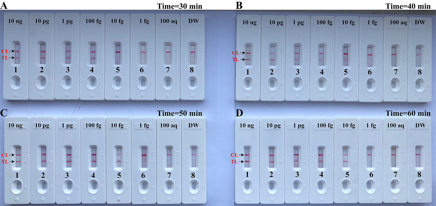 Particularly, optimal duration of time required for MCDA-LFB approach during the isothermal amplification stage also was examined. A total of four reaction times, including 30, 40, 50, and 60 min, were tested and compared at the optimal reaction condition, and the amplification results were indicated using LFB.