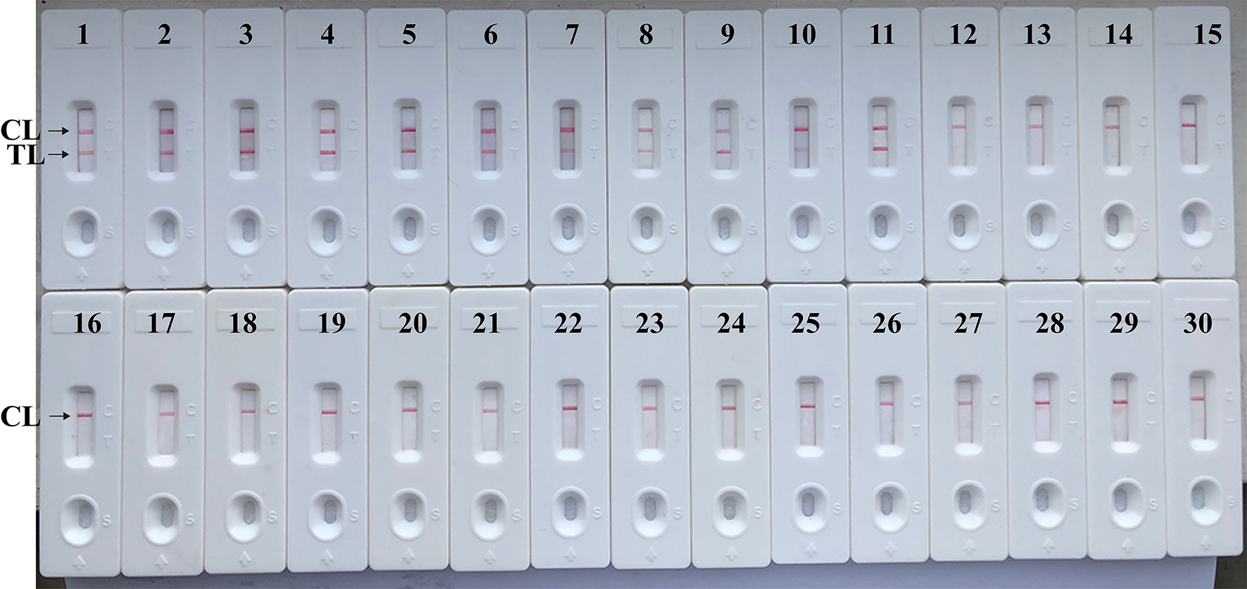Analytical Specificity of MCDA-LFB assay using different bacterial strains. The MCDA-LFB was evaluated using different genomic DNA templates. Biosensor 1, B. suis (GZ-CDC-S2); biosensor 2, B. melitensis (GZ-CDC-M5); biosensor 3, B. abortus (GZ-CDC-A19); biosensor 4, B. suis (isolated strain); biosensor 5–8, B. melitensis (isolated strains); biosensor 9, B. abortus (isolated strain); biosensor 9, B. canis (isolated strain); biosensor 10, B. ovi (isolated strain); biosensor 11, B. neotoma (isolated strain); Biosensor 12–29, Salmonella; Bacillus cereus; Shigella dysenteriae; Shigella boydii; Shigella flexneria; Shigella sonneri; Listeria monocytogenes; Enterococcus faecalis; Enterococcus faecium; Pseudomonas aeruginosa; Streptococcus pneumonia; Klebsiella pneumoniae; Vibrio cholera; Enterotoxigenic E. coli; Neisseria meningitidis; Bordetella pertussis; Staphylococcus aureus; Leptospira interrogans; Biosensor 30, negative control (DW).