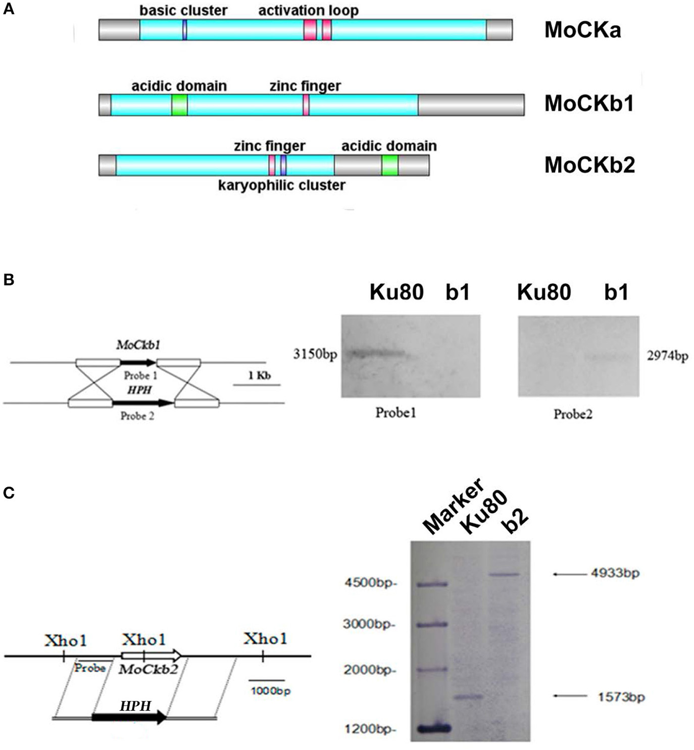 Domain structure of the identified CK2 proteins (A). MoCKa sequence (341 aa) was obtained from NCBI and the 35–320 region contains the protein kinase domain (https://www.ncbi.nlm.nih.gov/nuccore/XM_003716137.1) is labeled light blue, 70–73 is the basic cluster labeled dark blue and functions as a nuclear localization signal (NLS), 170–180, and 185–192 are activation loops (A-loop) labeled red. MoCKb1 sequence (351 aa) was obtained from NCBI and the 11–264 region contains the Casein kinase II regulatory domain (https://www.ncbi.nlm.nih.gov/protein/XP_003718622.1) labeled light blue, 61–74 is the acidic domain labeled green, 169–174 is the zinc finger domain labeled pink. MoCKb2 sequence (273 aa) was obtained from NCBI and the 15–195 region is the Casein kinase II regulatory subunit domain (https://www.ncbi.nlm.nih.gov/protein/XP_003710544.1) labeled light blue, 141–146 is a zinc finger labeled pink, 151–155 is a karyophilic cluster labeled dark blue that functions as a NLS, 234–247 is an acidic domain labeled green. The illustration was made using the DOG 2.0 Visualization of Protein Domain Structures http://dog.biocuckoo.org/. (B) ΔMockb1 mutant (named b1) was verified by Southern blot analysis. The genomic DNA extracted from the strains Ku80 and the mutant ΔMockb1 was digested with Nde1 and tested by Southern blot. The different probes ORF and HPH (hygromycin fragment) were amplified from the genomic DNA of the background strains Ku80 and the plasmid pCX62, respectively. (C) ΔMockb2 mutant (named b2) was verified by Southern blot analysis. The genomic DNA extracted from the strains Ku80 and the mutant ΔMockb2 was digested with Xho1 and tested by Southern blot. The probe was amplified from the genomic DNA of the background strains Ku80.
