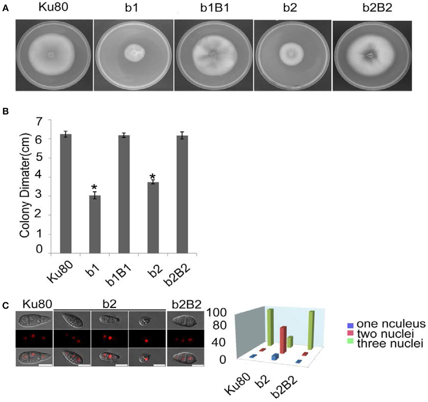 Intact CK2 holoenzyme is needed for normal growth. (A) Colonial morphology and vegetative growth of ΔMockb1 and ΔMockb2 deletion mutants (b1 and b2) and their respective complementation strains (b1B1 and b2B2) was observed on SYM agar plates incubated in the dark for 10 days at 25°C, and then photographed. (B) Colonial diameter of cultures as in (A) showing that the colonial diameter of b1 and b2 was significantly reduced. (C) (left) The conidial morphology of the ΔMockb2 deletion (b2) was detected and compared to background (Ku80) and the complement (b2B2). The red fluorescence shows the nuclear number in the conidia. The red fluorescence was due to the nuclear protein histone linker (MGG_12797) fused with mCherry used as nuclear marker. All bars = 10 um. (C) (right) The percentage of conidia with different nuclear number in the conidia produced by Ku80, b2, and b2B2 (about 300 conidia of each strain investigated). Error bars shows SE and a star indicate a P < 0.05 for control is same or larger than for the mutants.