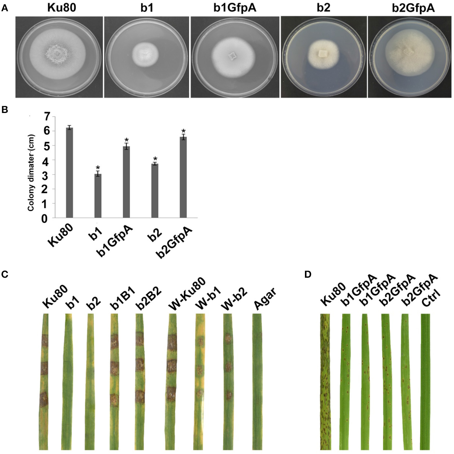 | b2GfpA | ΔMockb2 transformed with the over-expressed GFP-MoCKa fusion protein | This study |
