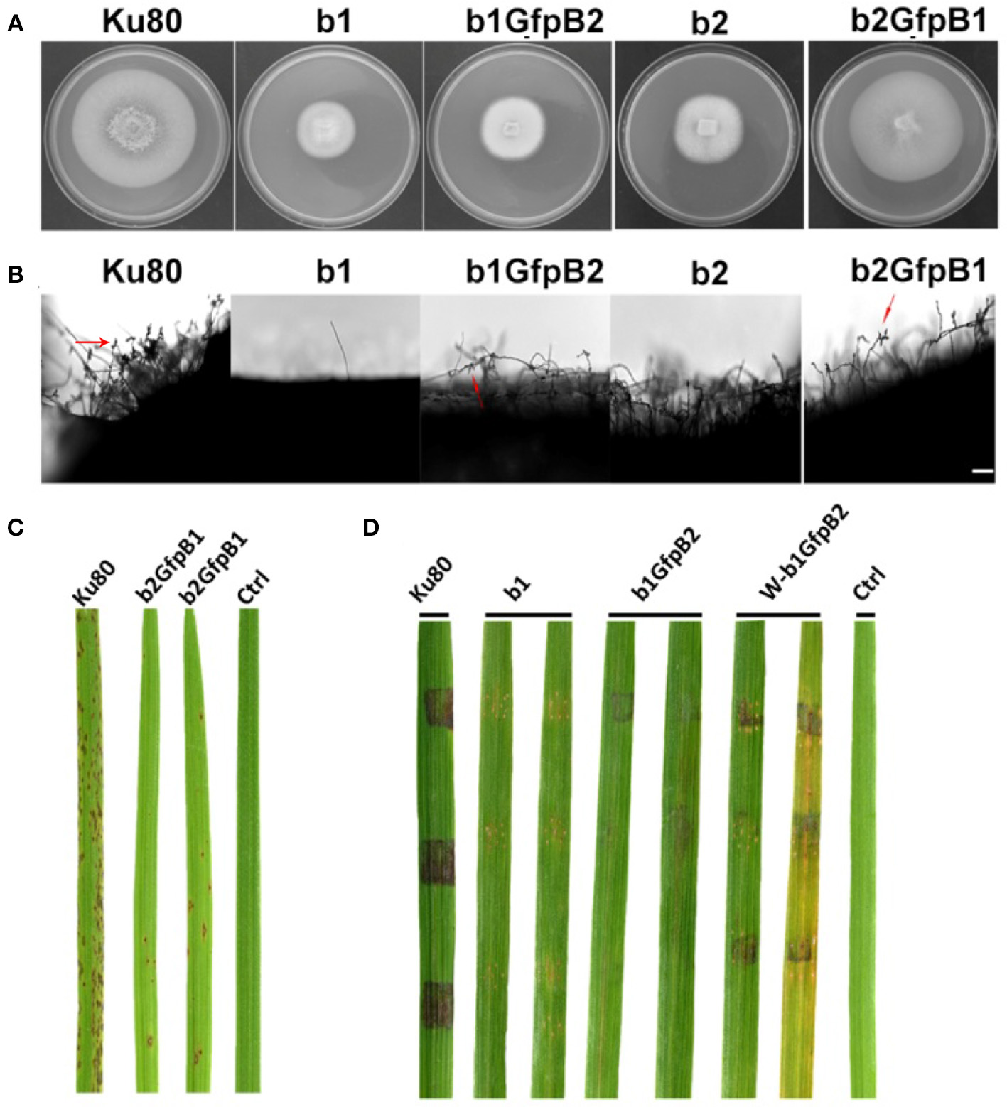 Phenotypic effects in the respective MoCKb deletion mutants of overexpression the other MoCKb component. (A) Colonial morphology and vegetative growth of strain b1, b1GfpB2, b2, and b2GfpB1 transformants was observed on SYM medium agar plates grown in the dark for 10 days at 25°C and then photographed. (B) Development of conidia on conidiophores. Light microscopic observation was performed on strains grown on the rice bran medium for 10 days. The red arrows indicate some conidia are produced by the b1GfpB2 and b2GfpB1 strains. Bar = 50 um. (C) Pathogenic analysis of the b2GfpB1 strain. Disease symptoms on rice leaves of 2-week-old seedlings were also inoculated by conidia suspension. The concentration of conidia suspension for inoculation was about 1 x 105/ml. (D) Pathogenic analysis of b1 and b1GfpB2 strains on rice. Disease symptoms on rice leaves of 3-week-old seedlings were inoculated using mycelial plugs. The W-b1GfpB2 indicates that the rice leaves were wounded before the agar plugs were placed. Typical leaves were photographed 6 days after inoculation. The rice strain was CO-39.