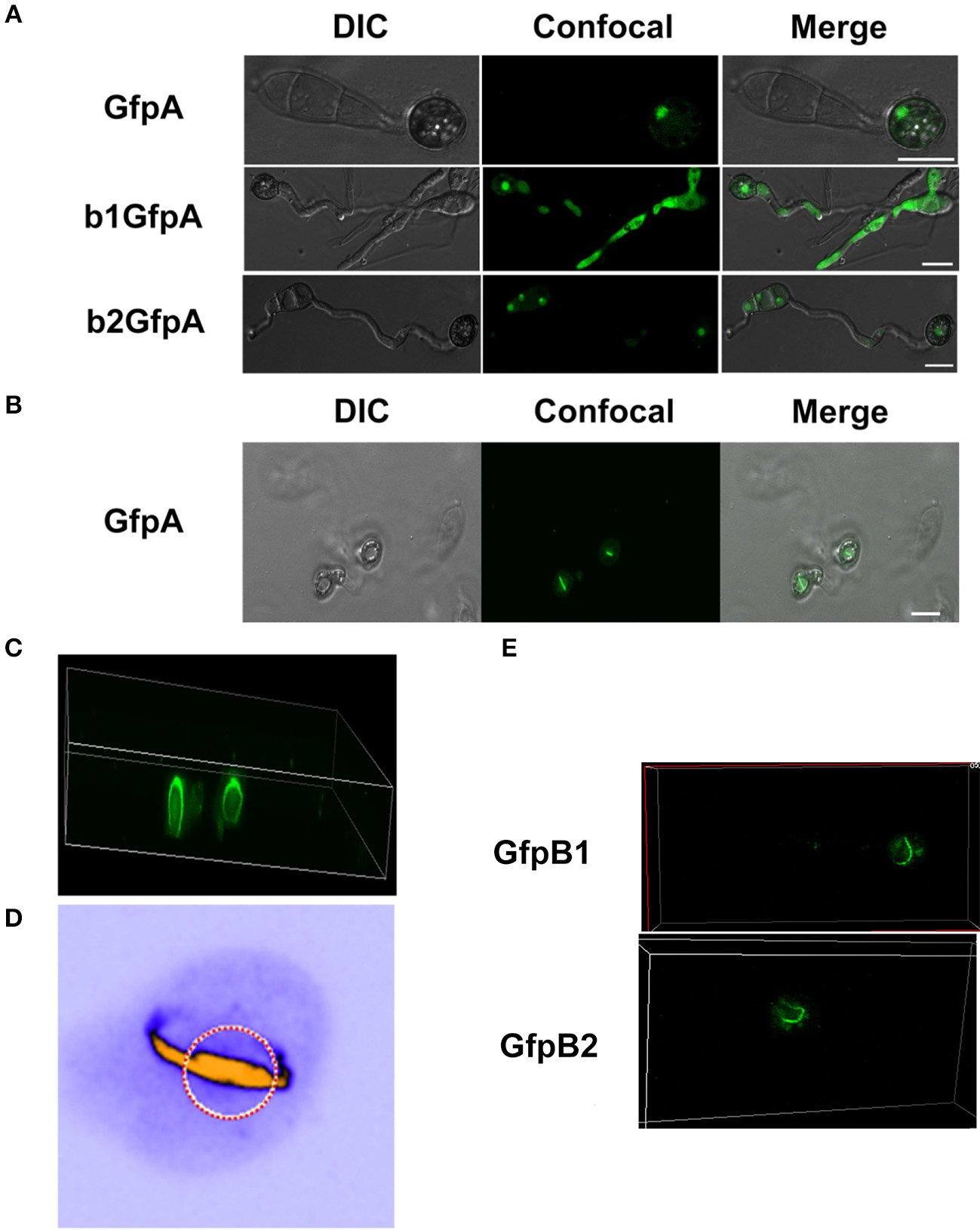 Localization of the GFP-MoCKa subunit in appressoria of the background strain Ku80 (strain GfpA) the and in the two MoCKb deletion strains (b1GfpA and b2GfpA) (compare Figures 3A,F,G). (A) Localization of GFP-MoCKa in all three strains show localization to nuclei. (B) In the strain GfpA that form appressoria from conidia a bright line of GFP-MoCKa can be seen across the appressorium penetration pores. (C) Through 3d scanning and then rotating the 3d reconstruction image (Video S1) we found that the streak across the penetration pores is a ring of GFP-MoCKa perpendicular to the penetration pore opening not present in the deletion strains b1GfpA and b2GfpA (Videos S2, S3). (D) False color lookup table 3d reconstruction image of the right ring structure in C enlarged and rotated back and seen from the same angle as in B with the penetration pore opening indicated by a red-white circle seen from the “plant” side (Videos S4, S5 for left and right ring in false colors). The false color was used so that the week fluorescence in the cytoplasm could be used to show the whole cytoplasm volume. The image was made using the analytical image analysis freeware ImageJ (https://imagej.nih.gov/ij/index.html) and the ICA lookup table in ImageJ was used for false colouring. (E) GFP-MoCKb1 and GFP-MoCKb2 also form rings in appressoria in similar ways as for GFP-MoCKa All bars = 10 μm.