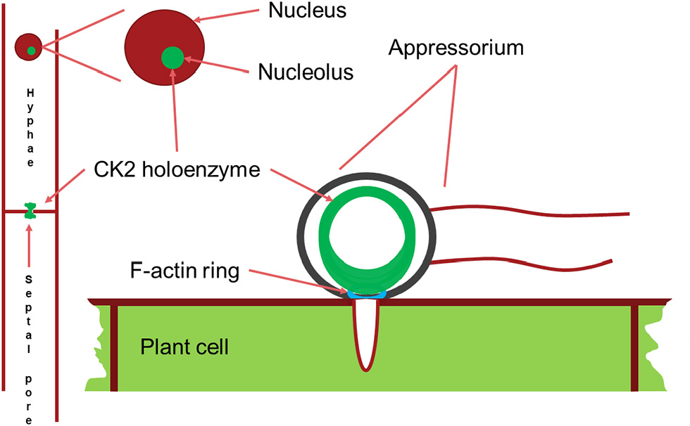 Our results show that M. oryzae CK2 holoenzyme (MoCK2) accumulates in the nucleolus, localizes in structures near septal pores, and assembles to form a large ring structure perpendicular to the appressorium penetration pore and is essential for normal growth and also plant infection.