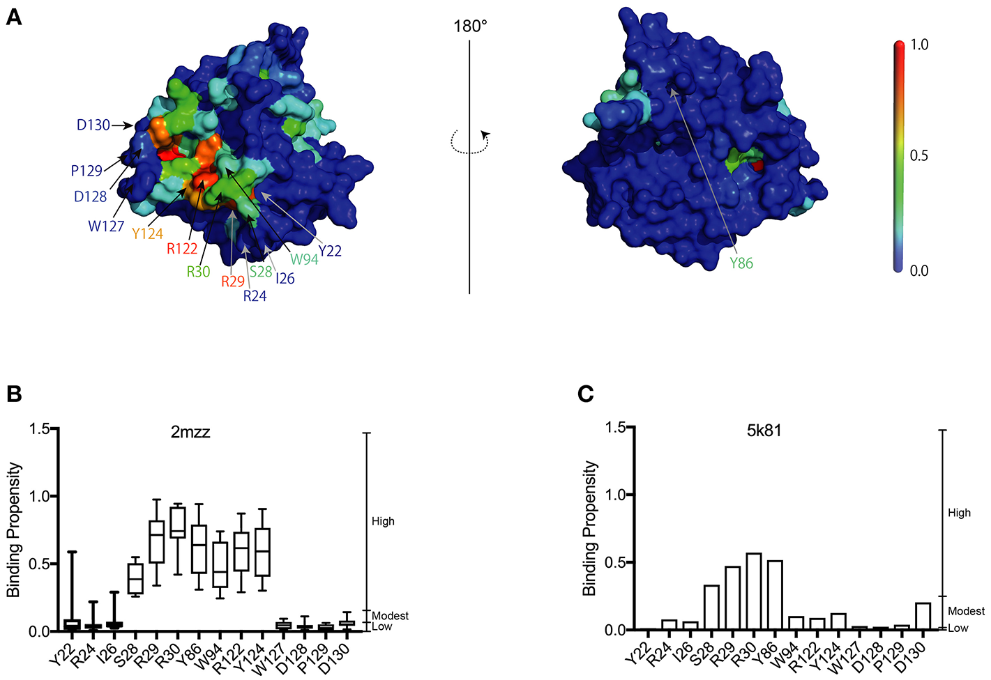 Supplementary Figure 8DNA-binding propensity (BP) of all residues in the homology model of human A3G-NTD based on the human A3G-NTD solution NMR structure (PDBID: 2mzz) predicted by aaDNA. The box plot shows the distribution of the BP for ten structures.