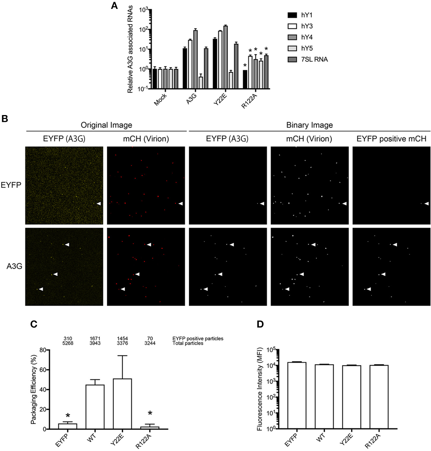 Analysis of the A3G-NTD R122 residue for RNA association and incorporation in HIV-1 virions. (A) Selective interaction of A3G and its mutants with cellular RNAs, 7SL and Y RNAs. Analysis of the interactions between cellular RNAs with HA-A3G by qRT-PCR is shown. Cell lysates from transfected HEK293T cells were immunoprecipitated with anti-HA antibody conjugated to agarose beads. RNAs were extracted from the co-immunoprecipitated samples and analyzed by qRT-PCR using primers specific for Y1, Y3, Y4, Y5, and 7SL RNA. Mean values and standard deviations of three independent qPCR reactions are shown for each condition. The level of the mock sample is set to 1. The asterisks indicate statistically significant decreases compared to the amount of cellular RNAs associated with A3G WT calculated by student t-test (p < 0.05). (B) Packaging efficiency of A3G mutants into HIV1-ΔVif virions determined by single virion imaging analysis. Representative images of virus particles labeled with Gag (mCherry) containing EYFP or EYFP-tagged A3G are shown. The left two panels show the original image, and the right three panels show the binary image constructed with an in-house MatLab script. EYFP expression plasmid was used as a negative control. White arrows indicate the mCherry particles that contain EYFP signals. (C) Packaging efficiency calculated by the percentage of Gag (mCherry) particles containing EYFP signal. The number of EYFP positive particles (upper) and total Gag-mCherry particles (lower) counted from three independent experiments is shown above the graph. Error bars represent standard deviations for three independent experiments. Asterisks indicate statistically significant decreases compared to EYFP-tagged A3G (student t-test, p < 0.05). (D) Intracellular expression of A3G and its derived mutants in virus producer cells determined by measuring EYFP intensity.