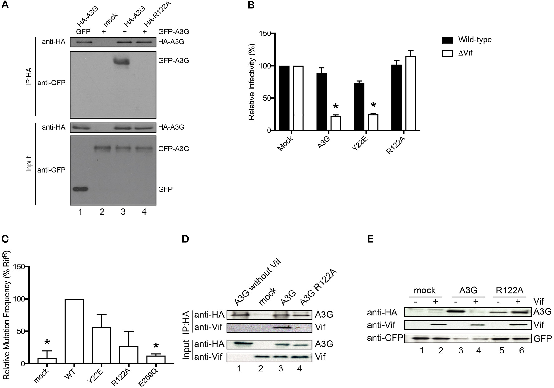 Functional analysis of the A3G-NTD R122 mutant. (A) Co-immunoprecipitation of HA-tagged R122A mutant with GFP tagged A3G WT. GFP-tagged A3G and HA-tagged R122A mutant were transiently co-expressed in HEK293T cells. Cell lysate and immunoprecipitated complexes were loaded on SDS-PAGE followed by immunoblot analysis using HA- and GFP-specific antibodies. HA-tagged A3G co-transfected with GFP alone served as a control for nonspecific binding of GFP to HA-A3G (lane 1) and GFP-tagged A3G alone served as a control for nonspecific binding to anti-HA beads (lane 2). The combination of HA-A3G-WT or –R122A mutant with GFP-A3G-WT is shown in lane 3 or lane 4, respectively. (B) Single-cycle infectivity of HIV-1 WT or ΔVif viruses produced in the presence of WT or mutant A3G proteins was measured in relative luciferase units and presented as percent infectivity relative to mock. The empty vector control is shown as mock. Three independent experiments were averaged and error bars represent the standard deviations. Asterisks indicate statistical significance of ΔVif virus infectivity compared to WT (student t-test p < 0.05). (C) Editing activity of WT and mutant A3G proteins determined by bacterial mutation assay. A deaminase defective E259Q mutant was used as a negative control. Mock indicates the empty vector control. Error bars represent the standard deviations of two independent experiments. The asterisks indicate statistical significance compared to WT (student t-test, p < 0.05). (D) Co-immunoprecipitation assays to determine the binding of Vif to the A3G-R122A mutant. The expression plasmids for the HA tagged A3G or R122A mutant and Vif were co-transfected into HEK293T cells (lane 3 and lane 4, respectively). MG132 proteasome inhibitor was added 12 h before lysing the cells, and A3G was immunoprecipitated with an anti-HA antibody and analyzed by immunoblot with the indicated antibodies. HA-A3G or Vif expression alone was used as a control for nonspecific binding (lane 1 or lane 2, respectively) (E) Vif-dependent degradation of A3G mutant, R122A. We co-transfected the expression vector HA-tagged A3G or R122A mutant with (lane 4 or lane 6, respectively) or without Vif expression plasmid (lane 3 or lane 5, respectively) into HEK293T cells. The amounts of cellular A3G from cells transfected with or without the Vif expressing plasmid were compared by immunoblot assay using an anti-HA antibody. GFP was used as the indicator for transfection efficiency. The lanes without HA-A3G (lane 1 or 2) are controls for nonspecific binding to anti-HA antibody.