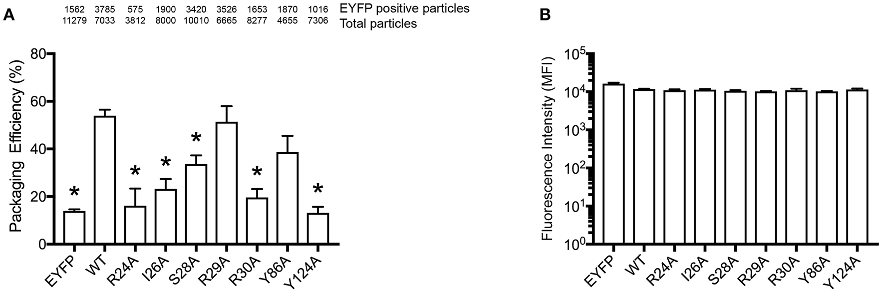 Packaging efficiency of A3G mutants into HIV1-ΔVif virions. (A) A3G packaging efficiency, and (B) Intracellular EYFP fluorescence intensity are shown as described in the legend for Figures 2C,D. The asterisks indicate statistical significance compared to WT (student t-test, p<0.05).