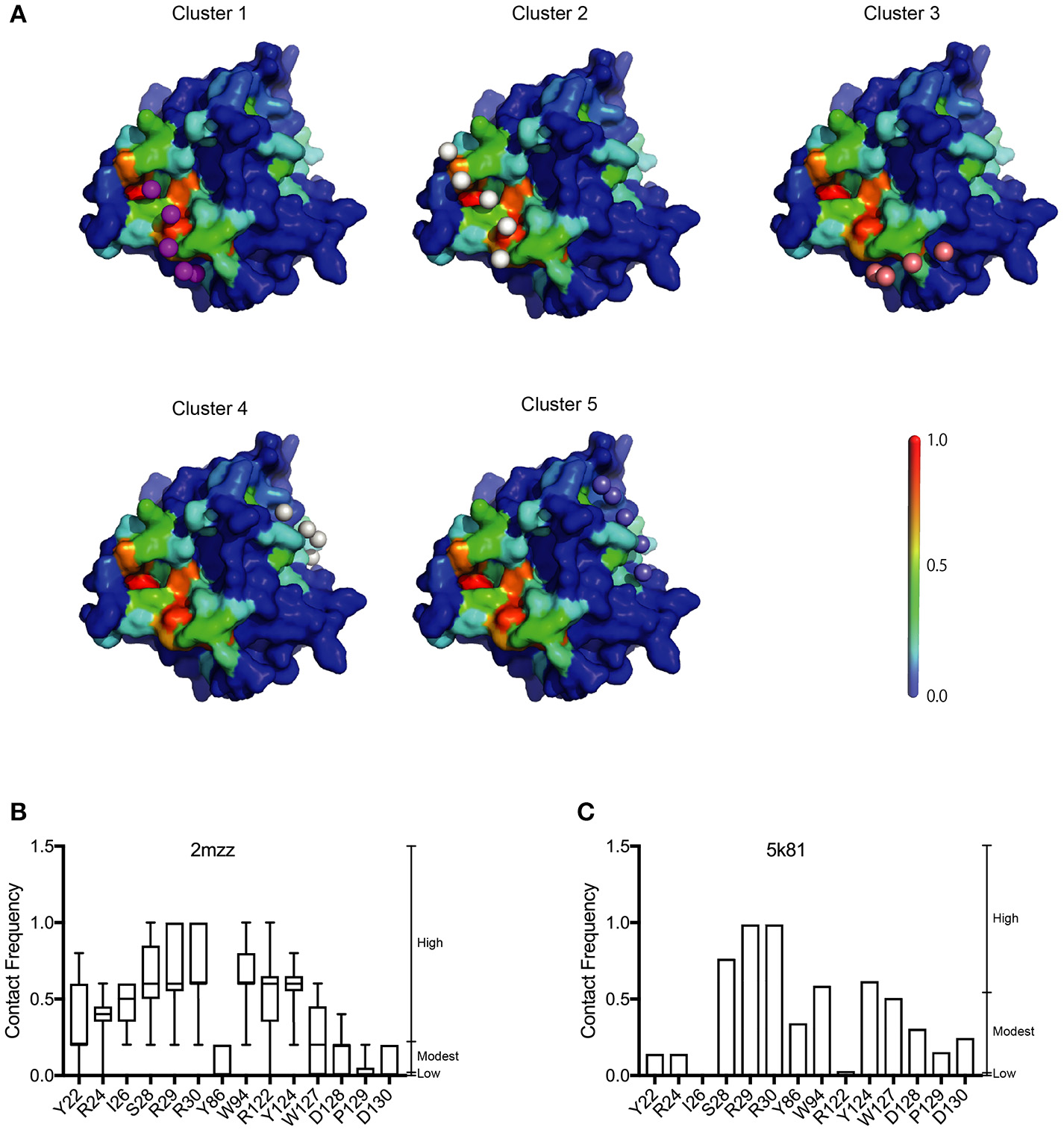 Supplementary Figure 9DNA-contact frequency (CF) of all residues in the homology model of human A3G-NTD based on the human A3G-NTD solution NMR structure (PDBID: 2mzz) with 5-mer single strand DNAs calculated by CGMD docking simulation. The box plots show the distribution of the CF of ten models with the top five clusters.