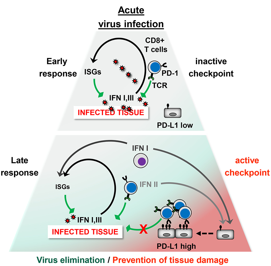 The PD-1/PD-L1 checkpoint in acute virus infection. Early phase: The infected tissue produces type I IFNs and possibly type III IFNs, which strongly induce antiviral IFN-stimulated genes (ISGs) but only moderate PD-L1 levels. Antiviral CD8+ T cells eliminate virus-infected cells. At this stage, the PD-1/PD-L1 checkpoint activity is low and does not restrict the antiviral immune response. Late Phase: Type II IFN and TNF-α is secreted by CD8+ T cells and other immune cells. In addition, hematopoietic cells such as plasmacytoid DCs (pDCs) produce large amounts of type I IFN. This results not only in virus elimination but also increases PD-L1 expression. The high checkpoint activity downregulates terminal differentiation of antiviral CD8+ T cells. Ideally, the strength and quality of the CD8+ T cell response is balanced out in such a way that the viral intruder is eliminated without causing immunopathology.