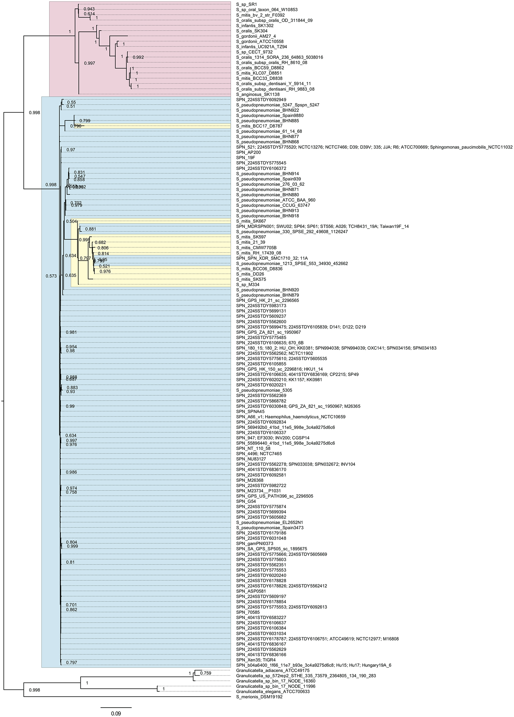 Bayesian phylogenetic analysis of the pfbA gene. The codon-based Bayesian phylogenetic relationship was calculated using the MrBayes program. Strains with identical sequences are listed on the same branch. S. pneumoniae and S. pseudopneumoniae pfbA genes are shaded in cyan. Other mitis group bacterial pfbA genes are shaded in magenta. S. mitis pfbA genes among S. pneumoniae are shaded in yellow. The posterior probabilities are shown near the nodes. The scale bar indicates nucleotide substitutions per site.
