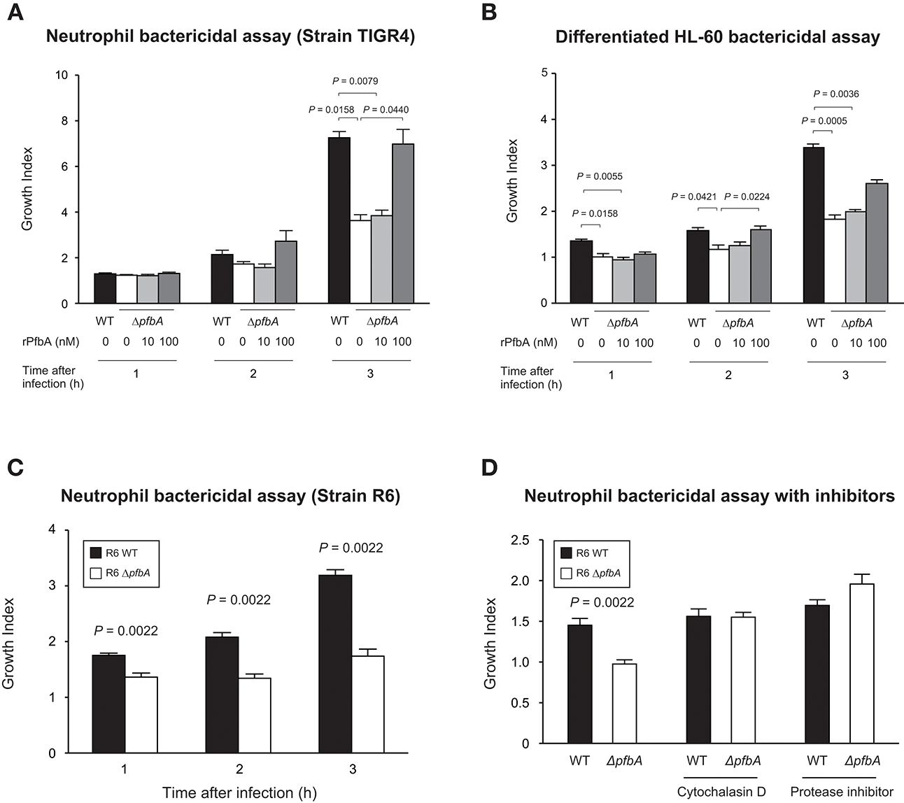 In summary, these results showed that pfbA deficiency in both S. pneumoniae TIGR4 and R6 strains decreased the survival rate after incubation with human neutrophils and differentiated HL-60 cells. Furthermore, rPfbA-addition recovered the survival rate of the ΔpfbA strain, with this recovery also observed following treatment with cytochalasin D and a protein-inhibitor cocktail. Additionally, PfbA-coated beads escaped phagocytosis, and time-lapse analysis showed that the ΔpfbA strain was more easily phagocytosed than the WT strain. These findings suggested that PfbA can directly inhibit phagocytosis.