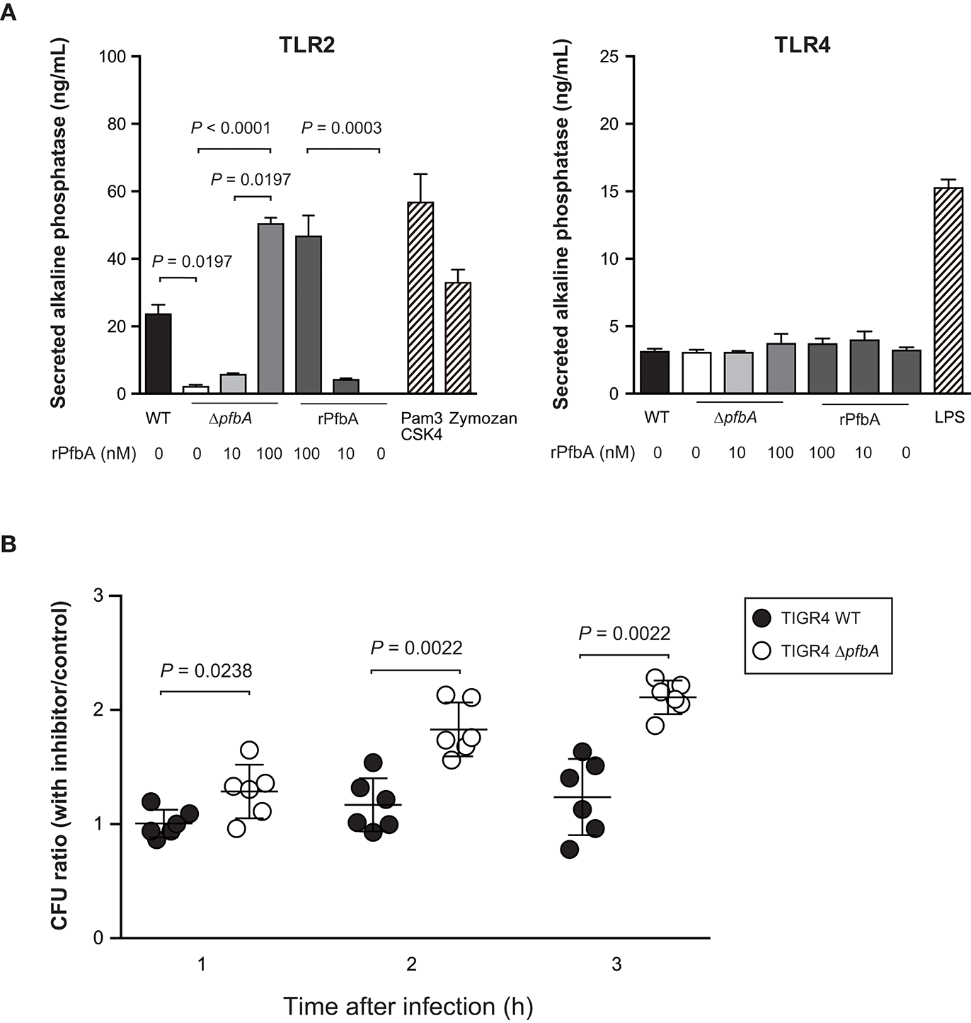 PfbA activates NF-κB via TLR2 and TLR2/4 inhibitor enhances ΔpfbA strain survival. (A) Secreted alkaline phosphatase (SEAP) porter assay using TLR2/NF-κB/SEAPorter or TLR4/MD-2/CD14/NF-κB SEAPorter HEK293 cell lines. The cells were plated in 24-well plates at 5 × 105 cells/well. After 24 h, cells were stimulated with various amount of rPfbA, pasteurized S. pneumoniae (~5 × 106 CFU), 1 μg/mL Pam3CSK4, 10 μg/mL Zymozan, or 25 ng/mL LPS for 24 h. SEAP was analyzed using the SEAPorter Assay Kit. Data are presented as the mean of six wells. SE values are represented by vertical lines. Differences in pneumococcal infection group and rPfbA addition group were analyzed using a Kruskal-Wallis test followed by Dunn's multiple comparisons test, respectively. (B) TLR2/4 inhibitor peptide enhances survival of the TIGR4 ΔpfbA strain incubated with human neutrophils. S. pneumoniae TIGR4 wild type strain or ΔpfbA strain bacteria were incubated with human neutrophils in the presence of TLR2/4 inhibitor peptide or control peptide. After 1, 2, and 3 h, the mixture was serially diluted and plated on TS blood agar. Following incubation, the number of CFUs was determined. The CFU ratio was calculated by dividing CFUs in the presence of inhibitor peptide by CFUs in the presence of control peptide. Data are presented as the mean of six wells. S.E. values are represented by vertical lines. Differences between groups were analyzed using Mann-Whitney's U-test.