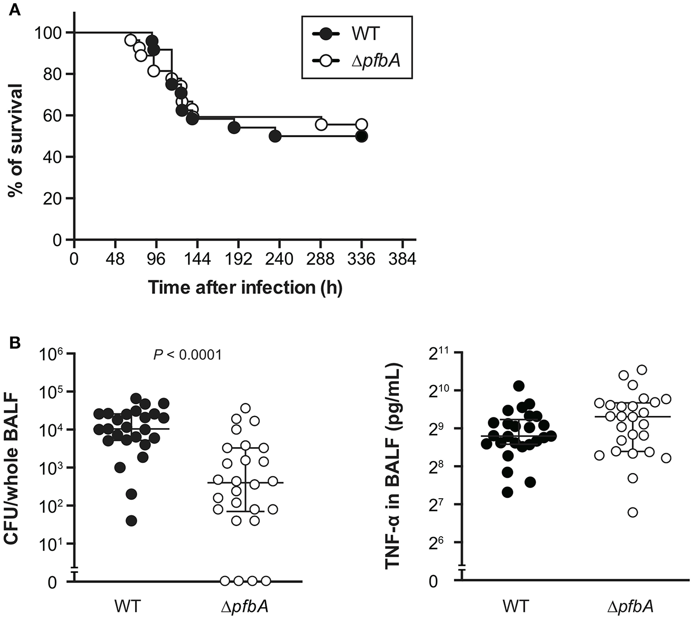In a mouse pneumonia model, deficiency of pfbA decreases pneumococcal burden in the lung but does not affect host mortality. (A) CD-1 mice were infected intratracheally with the S. pneumoniae TIGR4 wild-type or ΔpfbA strain (3–18 × 106 CFUs). Mice survival was recorded for 14 days. The differences between groups were analyzed using a log-rank test. (B) Bacterial CFUs and TNF-α in BALF collected from CD-1 mice after intratracheal infection with S. pneumoniae. CD-1 mice were infected intratracheally with the S. pneumoniae TIGR4 wild type or ΔpfbA strain (4–7 × 106 CFUs). BALF was collected at 24 h after pneumococcal infection, and bacterial CFUs and TNF-α levels in the BALF were determined. The median and interquartile range (IQR) values are represented by vertical lines. Statistical differences between groups were analyzed using Mann-Whitney's U-test. The data obtained from three independent experiments were pooled.