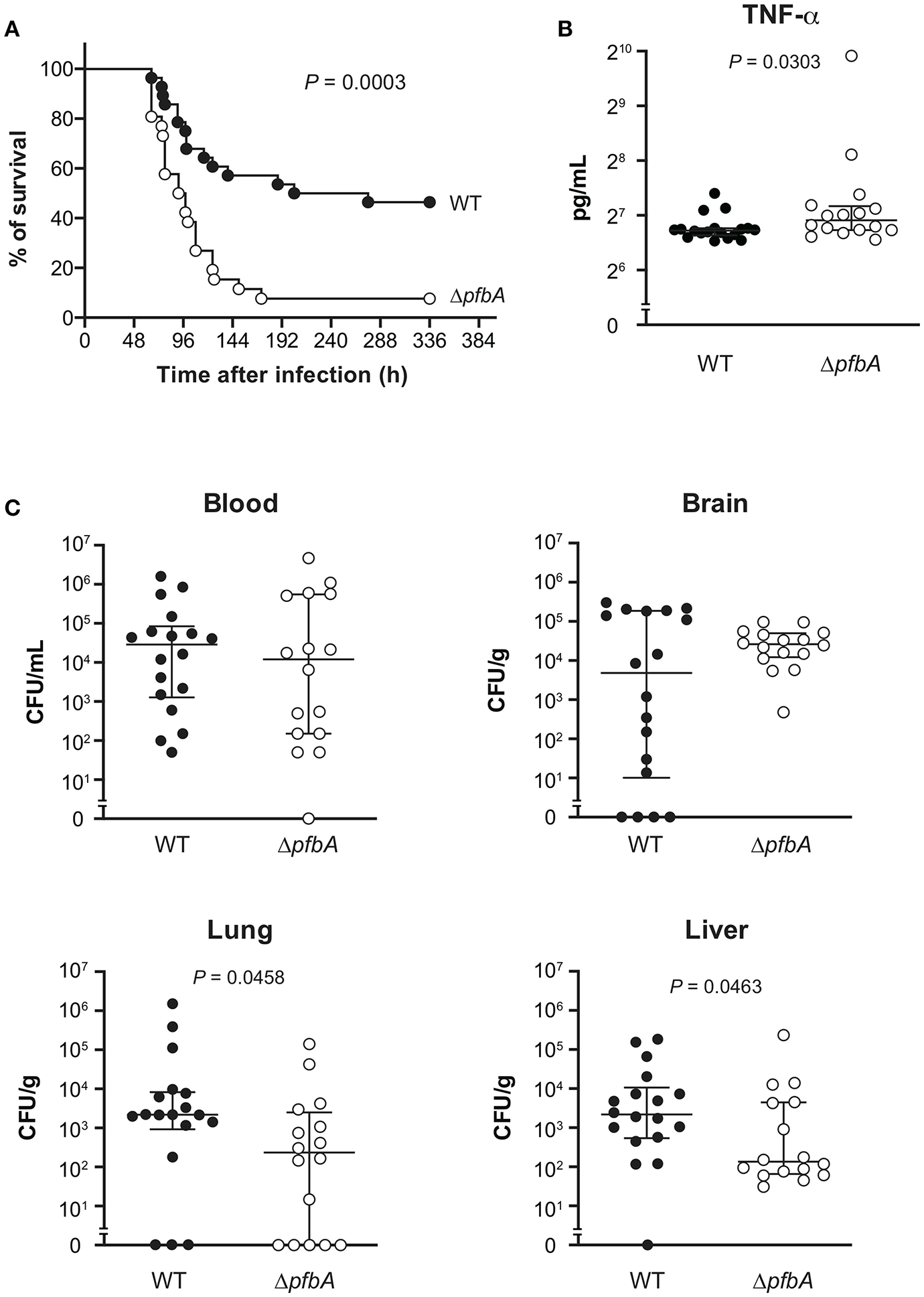 In a mouse sepsis model, the deficiency of pfbA increases the virulence and TNF-α level in blood but decreases the bacterial burden in the lung and liver. CD-1 mice were infected intravenously with the S. pneumoniae TIGR4 wild type or ΔpfbA strain (3–6 × 106 CFUs). (A) Mouse survival was monitored for 14 days. Statistical differences between groups were analyzed using a log-rank test. (B) CD-1 mice were infected intravenously with the S. pneumoniae TIGR4 wild type or ΔpfbA strain (6–9 × 106 CFUs). Plasma samples were collected from these mice at 24 h after infection. Values are presented as the mean of 16 or 18 samples. Vertical lines represent the median ± IQR. Statistical differences between groups were analyzed using Mann-Whitney's U-test. (C) The bacterial burden in the blood, brain, lung, and liver were assessed after 24 h of infection. The median and IQR values are represented by vertical lines. All mice were perfused with PBS after blood collection, organ samples were collected. Statistical differences between groups were analyzed using Mann-Whitney's U-test. The mouse survival data were obtained from three independent experiments, and the TNF-α level and bacterial burden values obtained from two independent experiments were pooled.