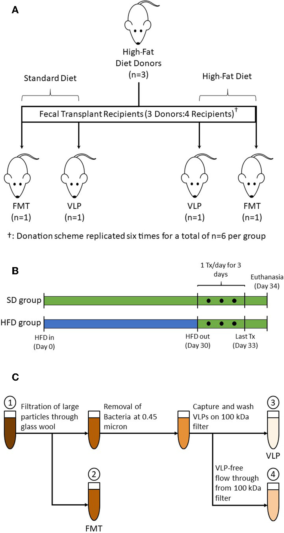 Fecal transplants were prepared using fecal samples collected from a total of 18 donor mice on day 30 of their HFD treatment. Donor mice were randomized into subgroups of three (for a total of six subgroups); pooled samples from each subgroup provided transplants for four recipient mice: one each of SD-FMT, SD-VLP, HFD-FMT, and HFD-VLP (Figure 1A). Therefore, in each comparison, the VLP treatment was derived from the same fecal samples used for FMT, and each replicate recipient within a given treatment was biologically independent (i.e., receiving transplants from an independent subgroup). The processing steps involved homogenizing 1.0 g of fresh fecal samples from each subgroup, suspending in PBS, and separating into two aliquots of equal volume: one for processing into a FMT and one for extracting the VLPs (Figure 1C). For FMT treatments, the fecal suspension was minimally processed using only filtration of the fecal suspension through glass wool to remove of large particles and debris. The FMT fraction was used for both SD-FMT and HFD-FMT recipient groups.
