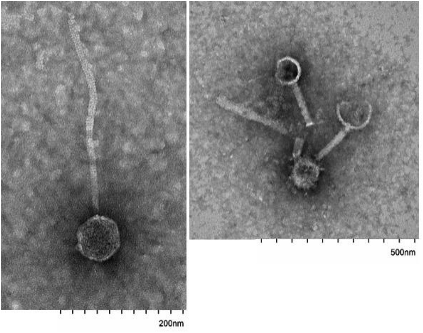Images of tailed phages in fecal VLP fractions identified using electron microscopy. Scale bars are indicated at bottom.