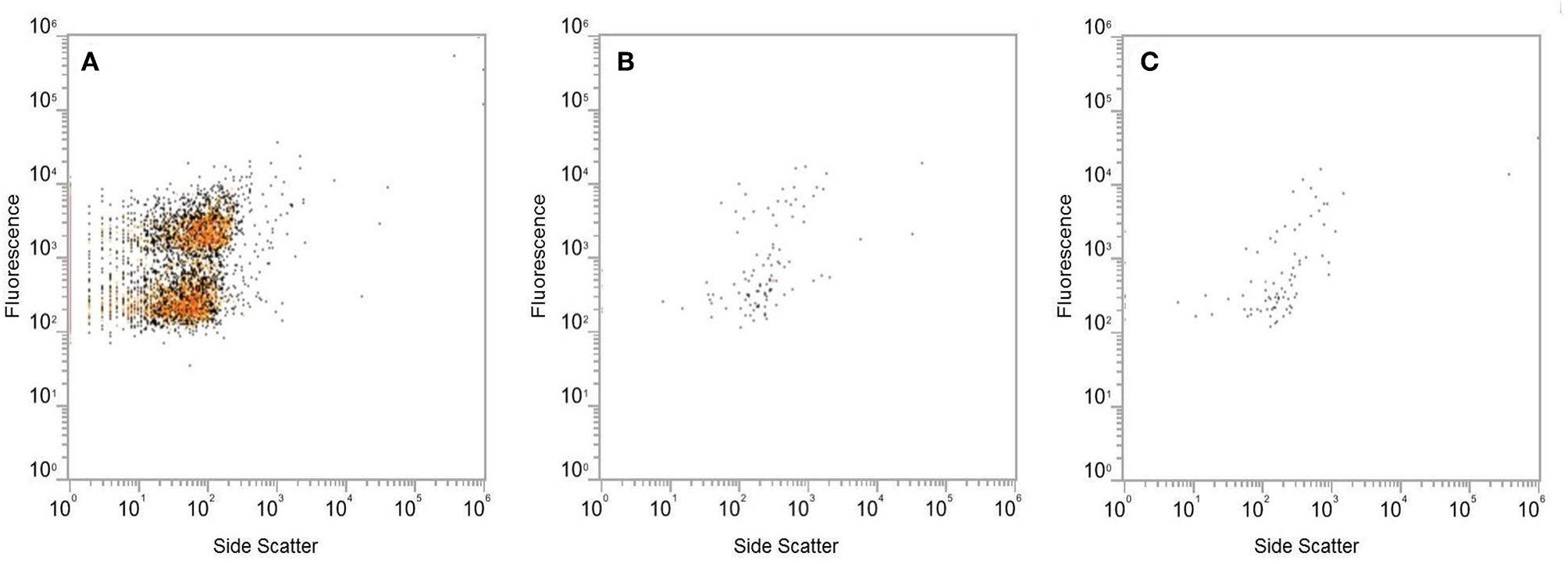 Analysis of the SYBR Green I-stained extracted VLP fraction by flow cytometry, using fluorescence and side scatter as metrics. Level of fluorescence differentiated two populations of VLPs in the extracted VLP fraction (A). The fluorescent signal produced by the flow through from Amicon Ultra 100 kDa filters (B) was at the same level as the PBS blank (C).