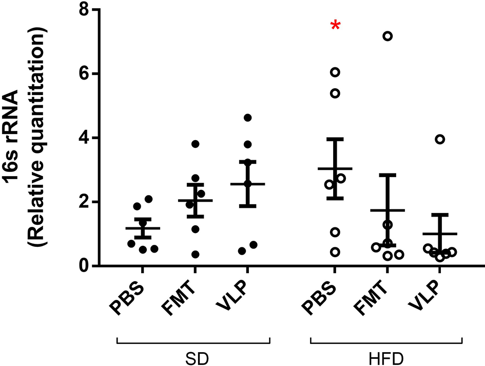 Relative quantitation of the bacterial 16s rRNA gene as a measure of mucosa-associated bacterial density. Data collected by qPCR analysis of extracted DNA from ileum of the small intestine are represented as fold-change relative to the SD-PBS control group and presented as mean ± SEM. Post-hoc analysis of these data using Grubb's test identified two outliers >2 standard deviations from the mean (p < 0.001), one from the HFD-FMT group and one from the HFD-VLP group. Data from these individuals were included in the graph but removed from all analyses (*p < 0.05).