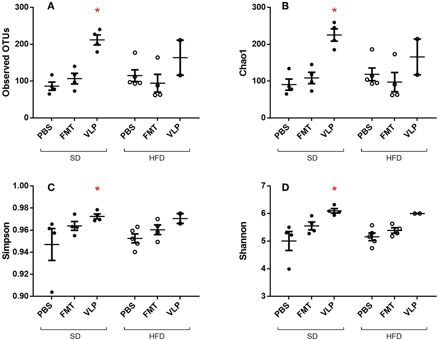 Alpha diversity measures of ileal microbiome as determined by Observed Operational Taxonomic Units (OTU) (A), Chao1 index (B), Simpson index (C), and Shannon index (D). Means with asterisks are significantly different from the SD-PBS control group (*p < 0.05).