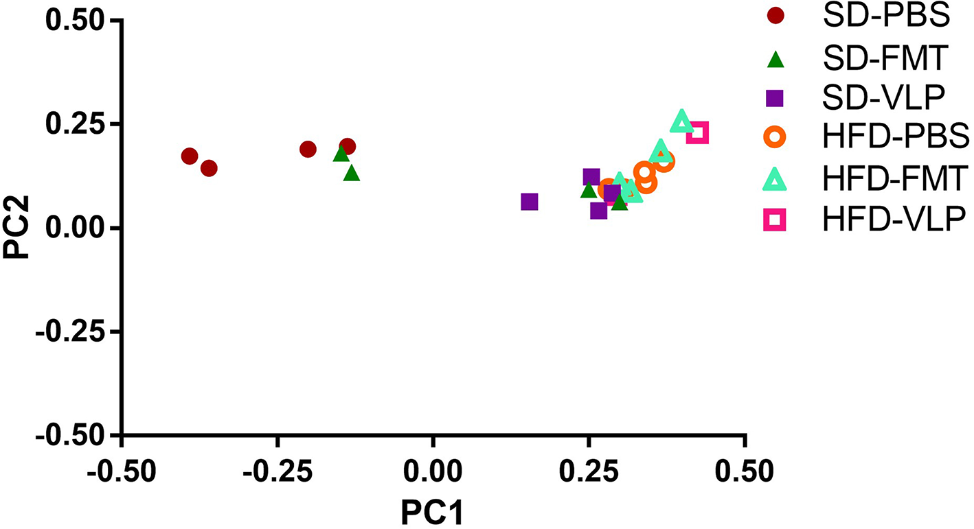 Principal coordinates analysis plot of weighted UniFrac distances for ileal microbiome beta diversity. A total of 13 mice were excluded from analysis due to low abundance after rarefaction: one from HFD-PBS, two each from SD-PBS, SD-FMT, SD-VLP, and HFD-FMT, and four from HFD-VLP.