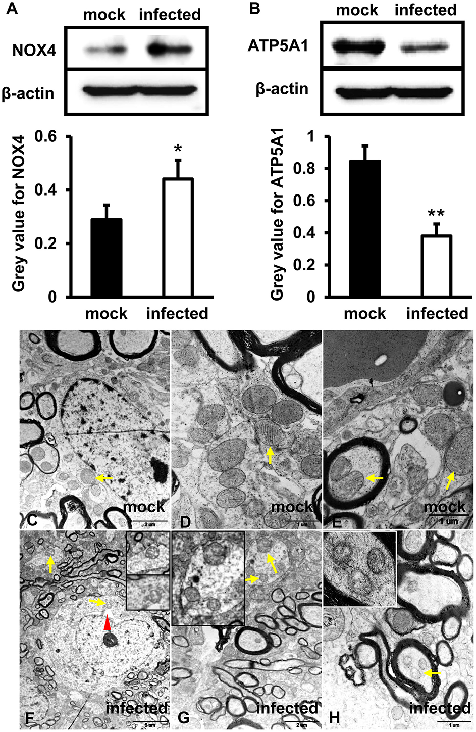 Mitochondrial dysfunction was related to an increased level of NOX4 and decreased expression of ATP5A1 in HEV infected brain tissues. (A,B)in vitro, HBMVECs were inoculated with 300 MOI HEV for 48 h for western blot, and HEV-negative homogenate served as control. Data showed that expression of NOX4 in HBMVECs treated with HEV for 48 h was significantly increased compared with mock group (*p < 0.05). Meanwhile, ATP5A1 was detected significantly attenuated in HEV inoculated cells (**p < 0.01). (C-H)In vivo, brain and spinal cord tissues that detected for HEV-RNA positive were selected for ultrastructural study. (C–E) Mitochondria were observed with clear cristae folded by the inner membrane in brain tissue of mock group. (F–H) Mitochondria with loss of cristae were found in tissues of HEV infected animals (arrows). The rough endoplasmic reticulum of neuron cells was also observed with mild distended cisternal space in HEV infected tissues (arrowhead). For western blot, gray value was analyzed with ImageJ to quantitatively analyze the expression levels of targeted proteins according to the level of exposure gray (resolution). Data were finally normalized to the expression of anti-β-actin.
