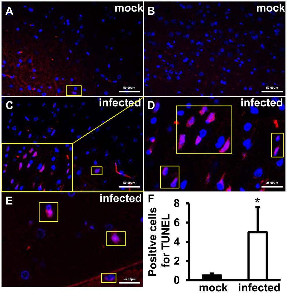 To explore roles of HEV infection on cell apoptosis, apoptotic cells were detected using TUNEL Assay Kit. The positive signals were mainly located in nucleus of cells in the brain. Few positive cells were detected in uninfected tissues (Figures 2A,B). More positive signals were observed in infected animals and high magnification images depicted granular masses of positive signals at nucleus of the apoptotic cells (Figures 2C–E). Further analysis showed that the apoptotic cells were significantly increased in HEV-infected brain tissues compared with uninfected animals (p < 0.05) (Figure 2F).