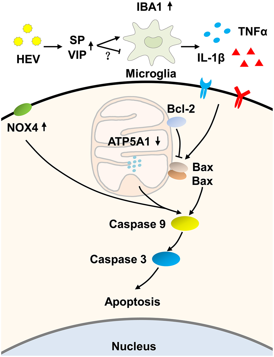 Hypothesized pathway of mitochondrial apoptosis activation induced by HEV infection. HEV entry to the brain tissue promoted the release of Substance P (SP) to activate microglial cells, while increased production of vasoactive intestinal peptide (VIP) negatively regulated activation of microglial cells as a compensatory response. Activated microglial cells produced more inflammatory cytokines such as TNFα and IL-1β. The release of TNFα and IL-1β further initiated mitochondrial apoptotic pathway. During the process, pro-apoptotic protein Bax induced ruptures of the outer membranes altered mitochondrial membrane permeability and further induced activation of caspase-9. Up-regulated expression of NOX4 and down-regulated expression of ATP5A1 also contributed to activation of caspase-9 and caspase-3 cascade and ultimately induced mitochondria-mediated apoptosis, which might be a potential way to eliminate virus but on the other hand caused neurological disorders.