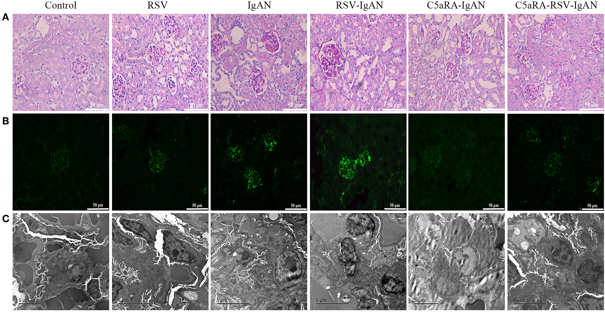 Kidney damage in IgAN mice is exacerbated by RSV but alleviated via C5aRA. (A) Representative images of pathological changes of kidney of PAS staining in different mice (400×). (B) IgA deposition in local kidney area were detected by immunofluorescence staining (200×). (C) Ultrathin kidney sections (70 nm) were stained with uranyl acetate and lead citrate, and then examined by transmission electron micrographs. N = 6 per group.