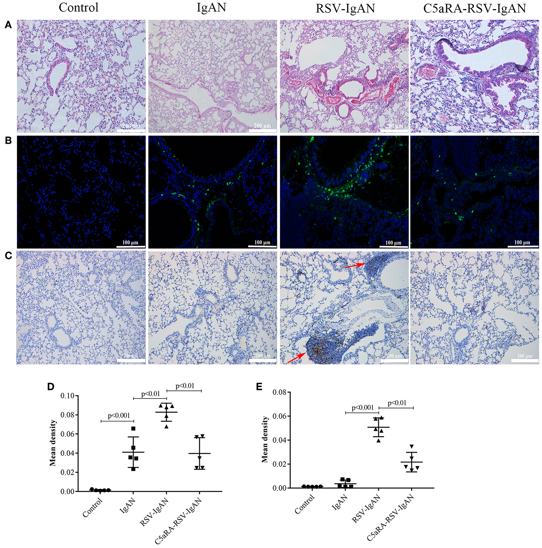 RSV exacerbates and C5aRA reduces lung damage and IgA deposition in IgAN mice. (A) Representative images of HE staining in lung tissues (200×). (B) Specific IgA deposition in lung tissues detected by immunofluorescence staining (200×). Light green, IgA deposition, blue, nuclear counterstain. (C) CD4 protein expression (200×) of lung tissues were assessed by immunohistochemistry. Red arrowheads, CD4 positive expression. The mean density of IgA deposition (D) and CD4 immunostaining (E) in lung tissues was calculated by Image J program. Data are expressed as mean ± sem of experiments in triplicate, n = 5 per group, t-test.