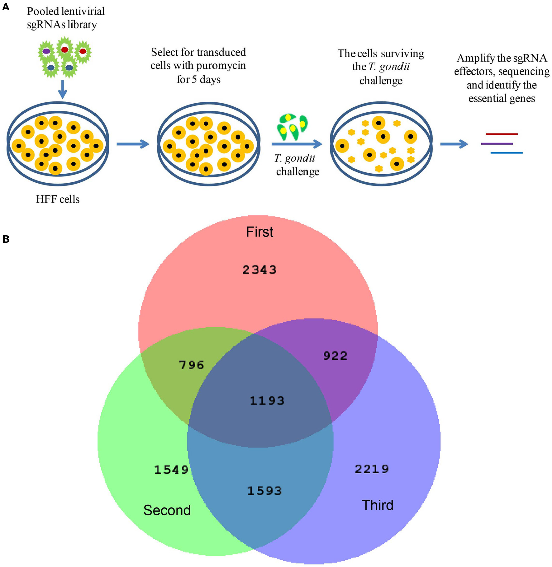 Screening of host dependency factors required by Toxoplasma gondii infection with CRISPR/CAS9-sgRNA library. (A) Screening flowchart. Human foreskin fibroblast (HFF) cells were transduced with lentiviruses at multiplicity of infection 1 (MOI = 1). Cells were subsequently selected using puromycin for 5 days. Transduced cells were infected with T. gondii (MOI = 1) for 10 days. Finally, the transduced cells that survived T. gondii infection were harvested, and the genomic DNA was extracted and subjected to high-throughput sequencing. (B) Venn diagram depicting the number of screened targets from independent biological triplicates: first replicate (red), second replicate (lime), third replicate (blue), and overlapped targets (middle).