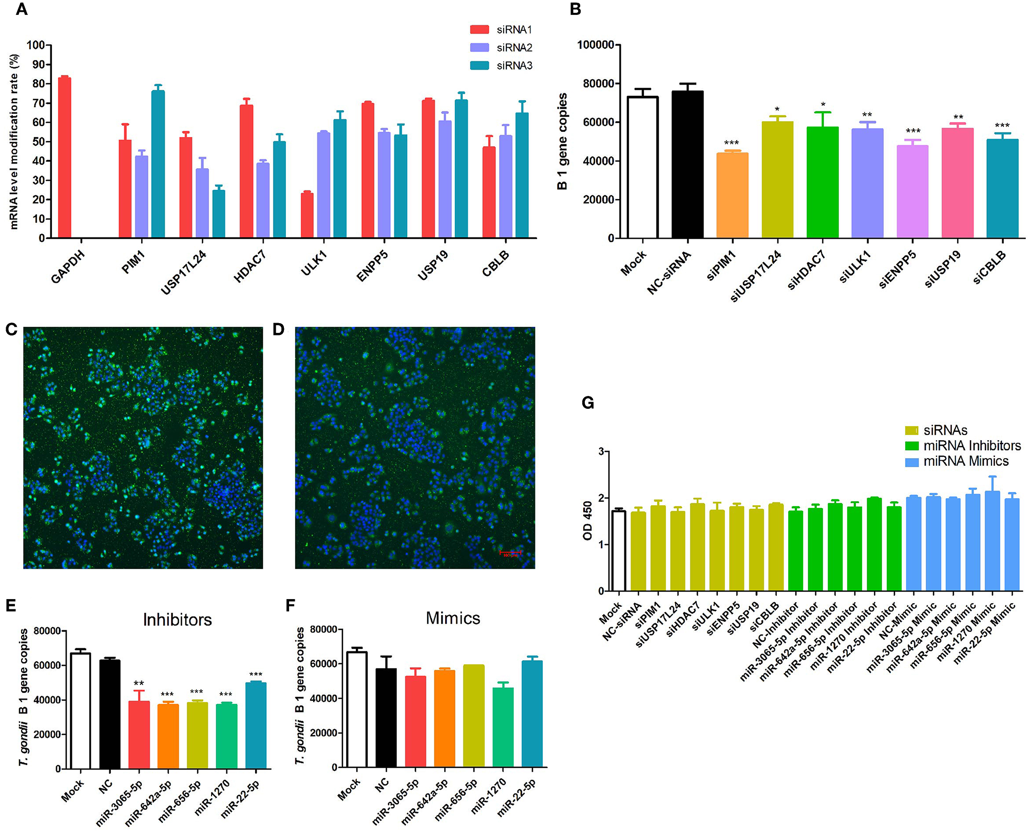 Validation of seven selected T. gondii host dependency factors (HDFs). (A) Among the HDFs, seven genes (CBLB, USP17L24, USP19, HDAC7, ULK1, PIM1, and ENPP5) were selected for siRNA gene knockdown assay on Hela cells. Three siRNAs were designed for each gene, and siRNAs with the highest knockdown efficiency were chosen for the further experiments. (B) When specific genes were knocked down with selected siRNA for 24 h, T. gondii was used to infect cells at MOI = 1 for 36 h. Proliferation of T. gondii was significantly inhibited in siRNA treated groups compared with mock and negative control siRNA treated groups. (C,D) FAM-tagged control miRNA inhibitor and mimic transfected Hela cells showed the transfection rate. (E,F) Compared with mock and negative control siRNA treated groups, multiplication of T. gondii was significantly suppressed in specific miRNA inhibitor treated group, but not significantly changed in mimic treated group. (G) Viability of Hela cells in siRNA, inhibitor, and mimic treated groups was not significantly changed. * p < 0.05, ** p < 0.01, *** p < 0.005.