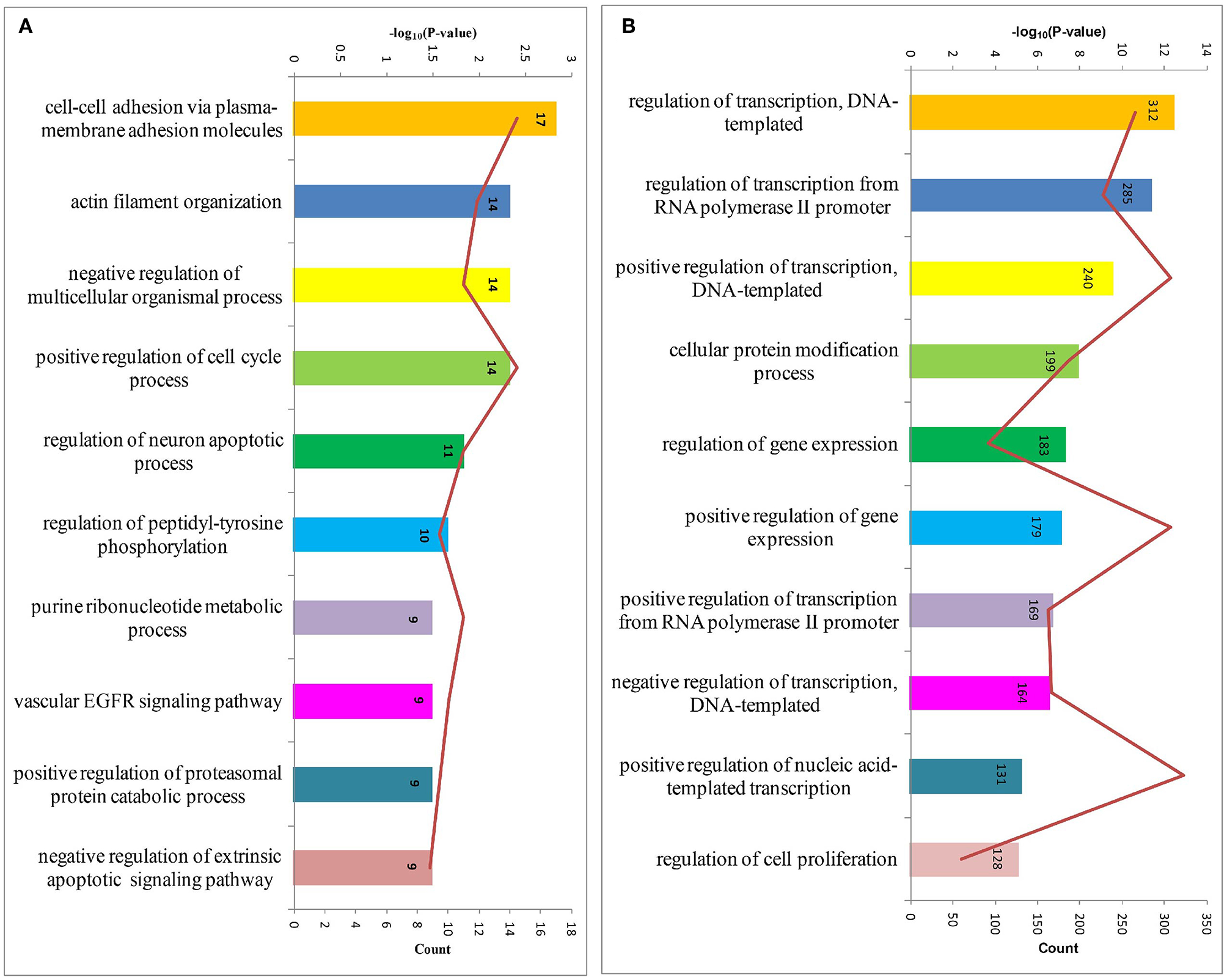 The top 10 enriched biological processes for host dependency genes and predicted target genes of host dependency miRNAs identified by Gene Ontology (GO) analysis. (A) Host dependency genes were significantly over-represented in the biological processes of actin filament organization, negative regulation processes, and regulation of apoptotic processes. (B) Host dependency miRNA predicted target genes were involved in a variety of positive regulation process, such as “positive regulation of transcription, DNA-templated” and “positive regulation of gene expression.” Stacked bar chart indicates the number of proteins overlapped with the database, and connected orange points represent the logarithm of p-values.