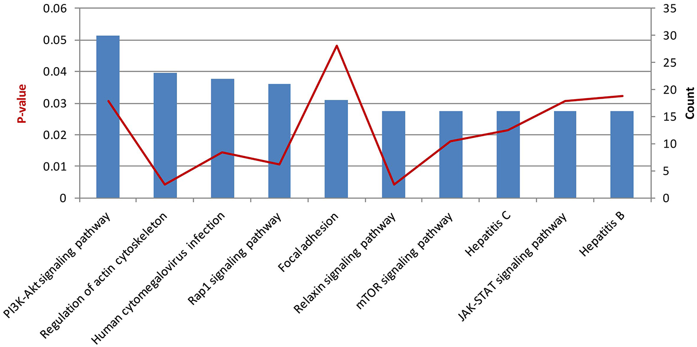 To further define the biological function of the identified potential HDF genes, Gene Ontology (GO) and Kyoto Encyclopedia of Genes and Genomes (KEGG) pathway enrichment were done using the online server Enrichr (http://amp.pharm.mssm.edu/Enrichr) (Kuleshov et al., 2016). Additionally, the STRING database (version 11.0; http://string-db.org) was used to explore and build the protein–protein interaction (PPI) network. Targetscan (Agarwal et al., 2015), miRWalk (Dweep et al., 2014; Sticht et al., 2018), and DIANA-microT (Paraskevopoulou et al., 2013) were used to predict the target genes of the mature miRNAs.
