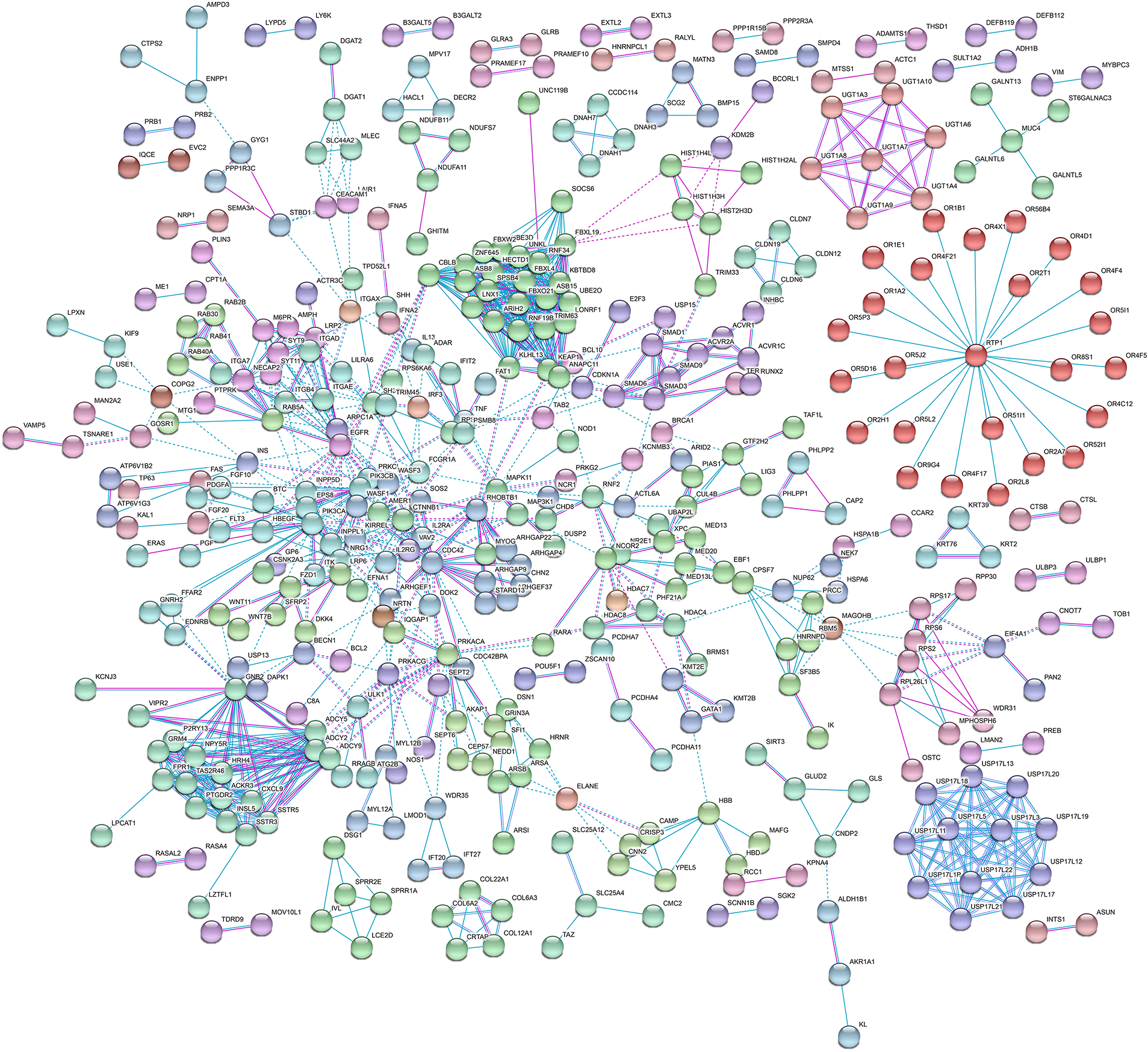 Then, we performed KEGG pathway enrichment to further investigate the significant human signaling pathways required by T. gondii infection. The top 10 enriched pathways for the 1,183 identified potential host dependency genes are shown in Figure 4 and Table S5. We found 30 genes enriched in the PI3K-Akt signaling pathway, 21 genes in the Rap1 signaling pathway, 16 genes in the mTOR signaling pathway, 16 genes in the JAK-STAT signaling pathway, 23 genes in regulation of actin cytoskeleton, 16 genes in the relaxin signaling pathway, 18 genes in focal adhesion, 22 genes in human cytomegalovirus infection, 16 genes in hepatitis C, and 16 genes in hepatitis B. These results indicate that the identified HDFs are important for infectious diseases and cytoskeleton reorganization. We further conducted a deeper exploration of the PPI networks by using the STRING 11.0 database to elucidate whether these potential HDFs were functionally related. Those reported experimental data and prediction databases were used as active interaction sources. By applying a high confidence of p > 0.7, 428 (36.12%) of the host dependency genes were enriched in a large PPI network, with a PPI enrichment p of 4.82e−07 (Figure 5), indicating that the screened HDFs were biologically connected as a network rather than a random set of proteins. As shown in Figure 5, 1,136 edges (PPIs) were observed among the 428 HDFs, and seven protein–protein-interacting clusters were evident in the network (Table S6). Among these, the biggest one was a cluster of E3 ubiquitin-protein ligases containing 25 proteins (in green), including TRIM63, UBE3D, HECTD1, ARIH2, ZNF645, and Casitas B-lineage lymphoma-b (CBLB) etc, notably, CBLB was observed as one of the main hubs situated in the core of this cluster. Then the second one was a cluster of 25 olfactory receptor proteins (in red) with receptor-transporting protein 1 (RTP1) in the center. A cluster of 12 ubiquitin-specific proteases (USP) (in medium slate blue) was also found among the seven PPI clusters.