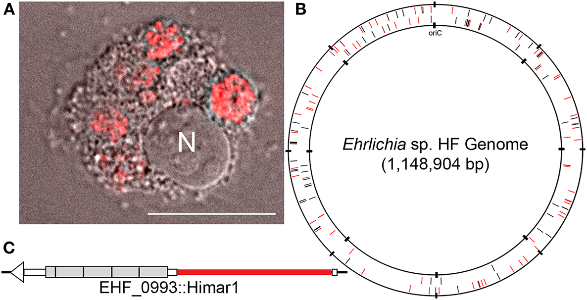 HF mutant and genomic map of the HF strain, showing transposon insertion sites. (A) HF mutant H53 expressing mCherry fluorescence in DH82 cells. N, nucleus. mCherry fluorescence/Differential Interference Microscopy. DeltaVision deconvolution microscopy, Scale bar, 10 μm. (B)Ehrlichia sp. HF chromosomal map showing transposon insertion sites. All mutant bacteria containing the Himar insertions were recovered from DH82 cells by the selection of spectinomycin and streptomycin antibiotics. Black lines represent intragenic insertions and red lines represent intergenic insertions. (C) HF mutant H60E (EHF_0993::Himar1). Insertion site is near 5′-end of the gene encoding TRP120 at upstream of the 4 1/4 of the 300-bp tandem repeats (shown in gray boxes) in TRP120, likely disrupting this protein's expression or function.