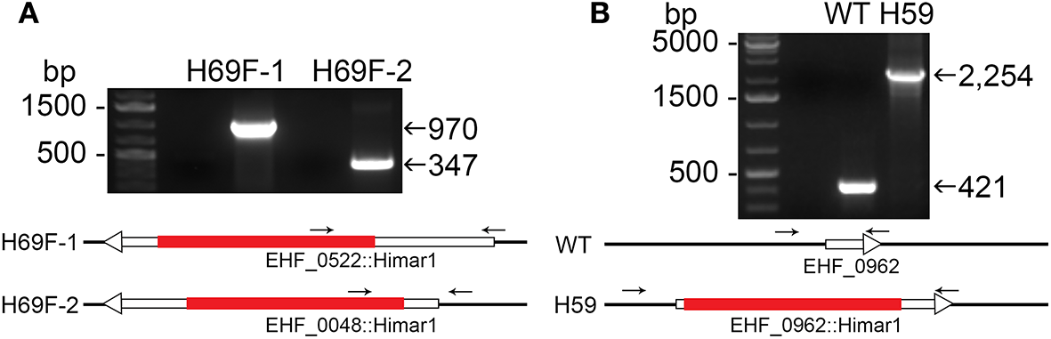 Insertion site-specific PCR to verify insertion site and flank PCR to verify clonality. (A) Specific insert PCR showing insertion sites at specific genomic loci of EHF_0522::Himar1 and EHF_0048::Himar1. (B) Flank PCR demonstrating clonality of EHF_0962::Himar1, arrows—PCR primers, red bar—Himar1 insert containing aad/mCherry, white boxes with arrow—ORFs. The lengths of ORFs and Himar1 insert were drawn to scale except primers that are enlarged.