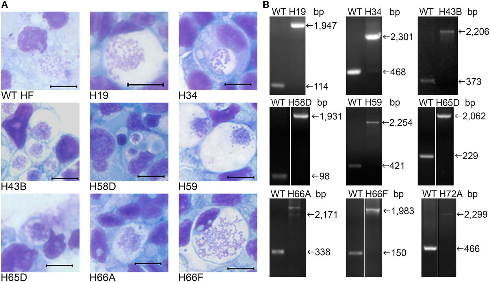 Infectivity of cloned HF Himar1 mutants in ISE6 tick cells. Cloned HF Himar1 mutants and WT HF cultured in ISE6 tick cells. (A) HEMA3 staining. Scale bar, 10 μm. (B) Insertion site-specific flank PCR confirming clonality of each mutant in tick cells.