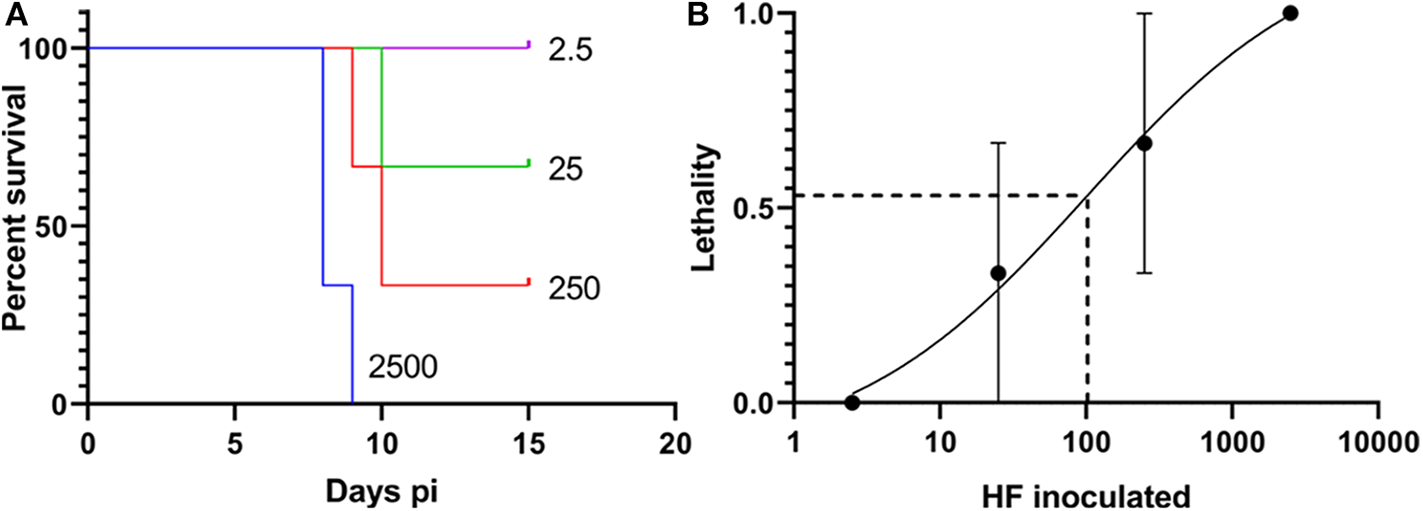 LD50 of the Wild-type (WT) HF strain. (A) Kaplan-Meier survival curves for WT HF bacteria, number of inoculated bacteria/mouse is shown for each curve, N = 3, Log-rank, Gehan-Breslow-Wilcoxon test among each group: P < 0.01. (B) Sigmoidal curve showing the calculation of WT HF culture. LD50 is based on survival with 10-fold dilutions, calculated from AAT Bioquest LD50 calculator, with means and standard error (N = 3).
