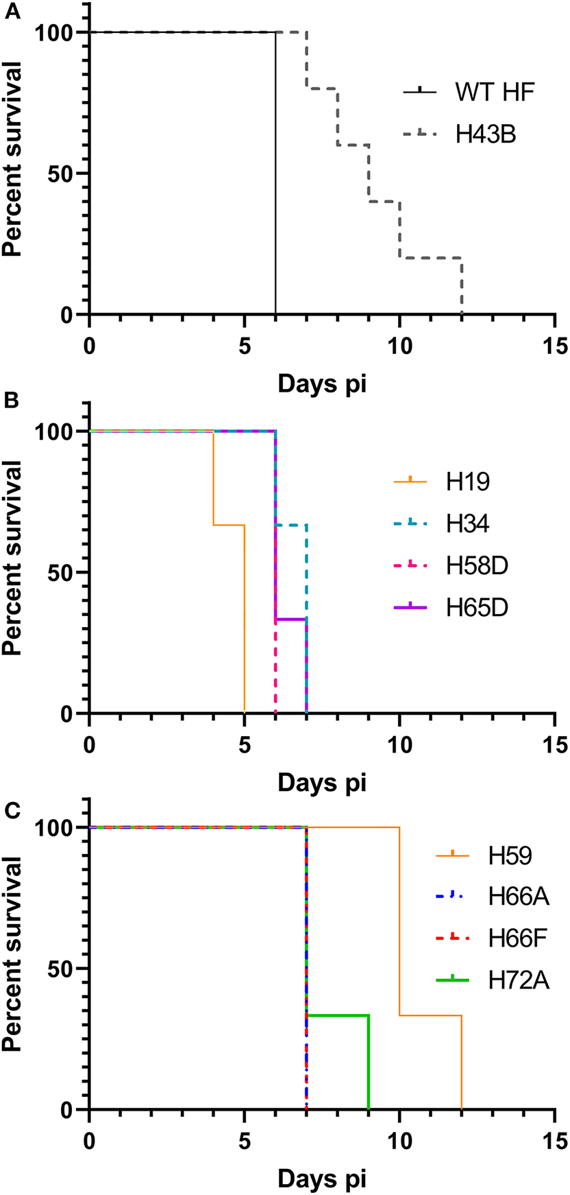 Kaplan-Meier survival curves for mice inoculated with nine cloned mutants. (A) Wild type and H43B. Compared with WT, H43B survived significantly longer, P < 0.05 by the Log-rank test (N = 5). (B,C) Compared to H59, each clone P < 0.05 by the Log-rank test (N = 3). (B,C) Were separated for figure clarity.