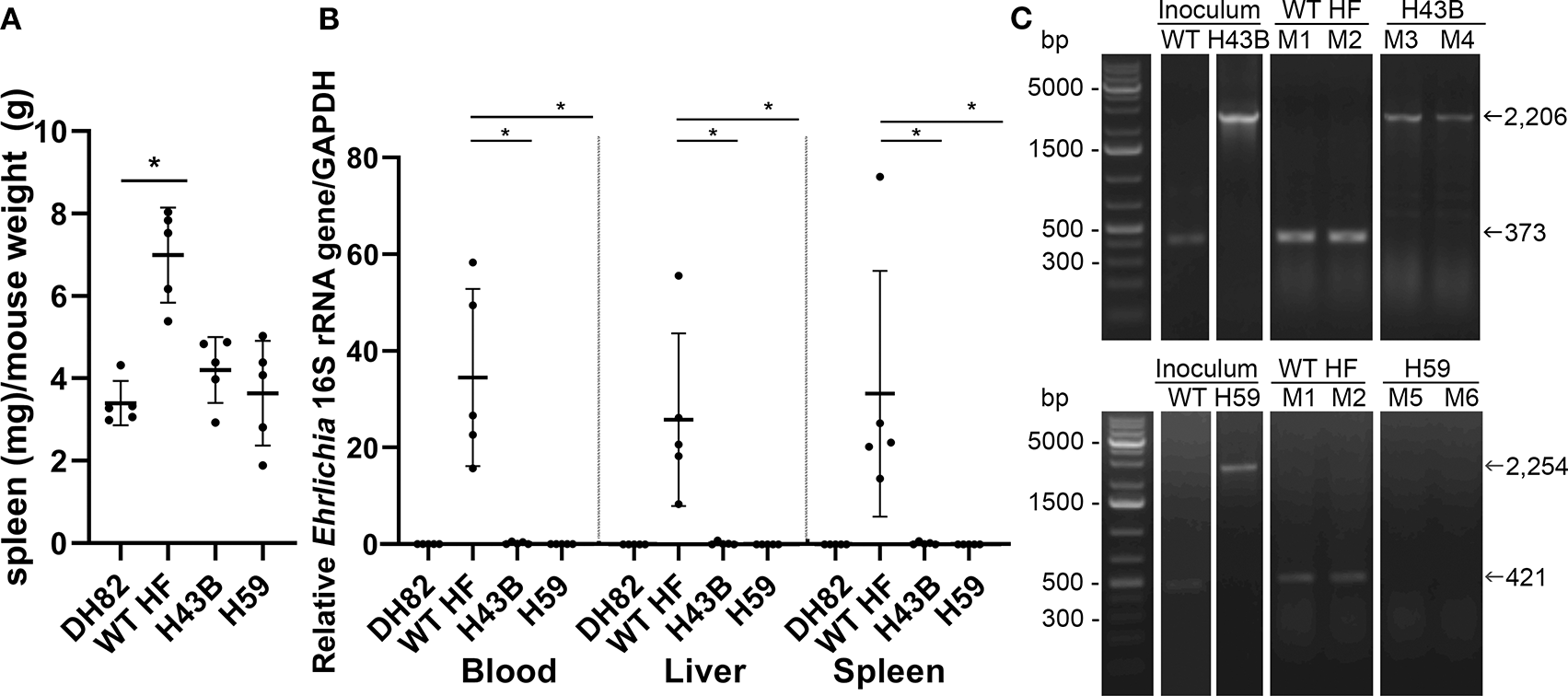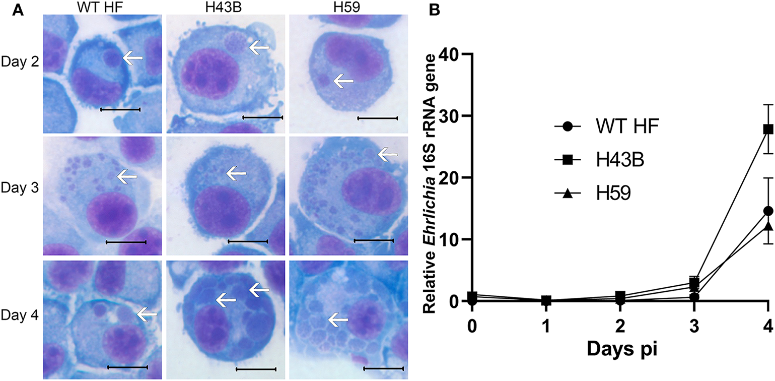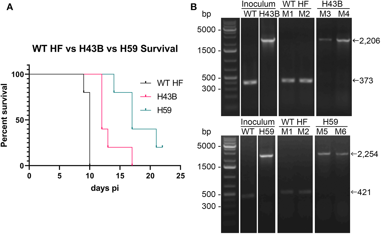 We investigated whether Himar1 insertions affected the HF strain's mouse infectivity and pathogenesis. Immunocompetent mice were inoculated intraperitoneally with nine cloned mutants and WT HF strain at ~5–15 × 106 bacteria/mouse. With this high dosage, most mice became severely moribund and lost >20% body weight and were euthanized, or died at 4–12 days post-inoculation (pi) (Figure 5). However, mice inoculated with H59 and H43B mutants survived significantly longer at 8–12 days pi (Figure 5), hence, these two mutants were selected for further study. H59 has insertion in EHF_0962 (conserved hypothetical protein, 119 aa) and H43B has insertion in EHF_RS04100 (conserved hypothetical protein, 651 aa) (Table 2). Although no known motif was detected in EHF_0962, staphylococcal superantigen-like (SSL) domain (Fraser and Proft, 2008) (aa 429–537, E-value 2.47 × e−04) was detected in EHF_RS04100. Compared with WT, H59, and H43B infection and growth in DH82 macrophage were similar by quantitative PCR (qPCR) (Figure 6). When ~4 × 104 WT HF were inoculated per mouse, all five mice were severely moribund necessitating euthanasia or died on day 9–10 pi, however mice inoculated with H43B were euthanized or died from day 12 to 17 pi. Mice inoculated with H59 were euthanized or died from day 13 to 21 pi, with one mouse apparently recovering from illness on day 22, when the experiment was terminated (Figure 7A). Clonality of H43B and H59 in inoculated mice were verified by insertion site-specific flank PCR at euthanasia in the liver samples of inoculated mice (Figure 7B). Thus, H43B and particularly H59 mutants have partially reduced virulence in mice.