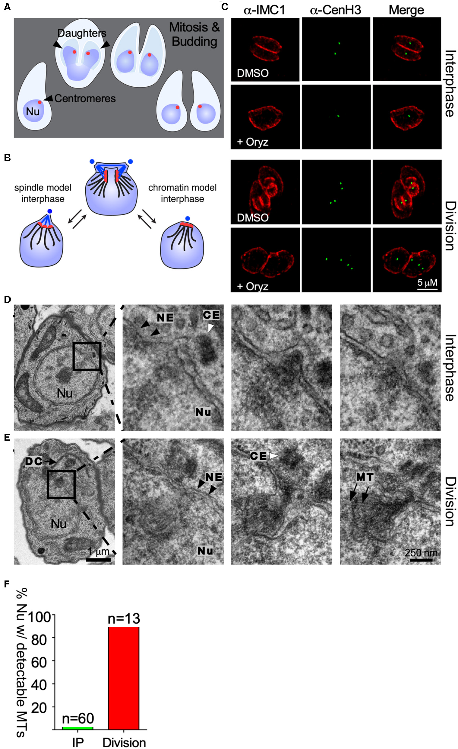 Centromere clustering is not mediated by spindle microtubules. (A) Apicomplexan parasite division schematic. Apicomplexa divide by closed mitosis and internal daughter cell assembly. Centromeres (represented as a red dot) remain clustered at the periphery of the nucleus throughout the cell cycle. (B) Alternative models proposed to explain centromere clustering. Blue dots represent the centrosome. Blue lines represent the mitotic spindle microtubules. Red dots represent the chromosomes' centromeres. (C) Parasites were treated with DMSO (control) or 2.5 mM Oryzalin, fixed and stained with anti-IMC1 and anti-CenH3. Both in DMSO and Oryzalin treated samples, interphase parasites display a single TgCenH3 dot corresponding to clustered centromeres. Both Oryzalin treated and untreated dividing parasites display duplicated TgCenH3 foci. In Oryzalin treated parasites daughter cell assembly and proper chromosome segregation is impaired as evidenced by the presence of multiple (>2) TgCenH3 foci within a single parasite. (D) TEM series through a parasite in interphase containing a single centrosome (CE, white arrowhead). Zoomed-in panels show consecutive series. Microtubules (MT) are not seen proximal to the centrosome (CE, white arrowheads) or the nuclear envelope (NE, black arrowheads) at the site of centromere sequestration. (E) TEM series through a dividing nucleus. A forming daughter cell (DC) is detectable proximal to the nucleus (Nu). The mitotic spindle organizes within the nuclear envelope (NE, black arrowheads). Zoomed-in panels show consecutive series. Microtubules (MT, black arrows) of the mitotic spindle are clearly visible in the proximity of the centrosome (CE, white arrowhead). Note that all serial sections were obtained from the same block, and thus were subject to identical fixation and post-fixation treatments. The scale for (D,E) is the same. (F) Parasites present in TEM serial sections were classified as “interphase” (IP) or “dividing”, depending on the presence of a single or a duplicated centrosome respectively, and scored for the presence of visible spindle microtubules.